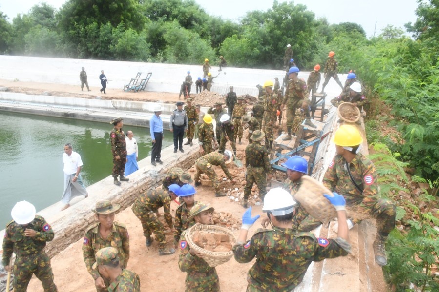 ထိုသို့ ဆောင်ရွက်ပေးလျက်ရှိရာ ယနေ့တွင် ကာကွယ်ရေးဦးစီးချုပ်ရုံး(ကြည်း)မှ ဒုတိယဗိုလ်ချုပ်ကြီး သက်ပုံနှင့် တာဝန်ရှိသူများသည် စစ်ကိုင်းမြို့အတွင်းရှိ ငလျင်ဒဏ်ကြောင့် ထိခိုက်ပျက်စီးခဲ့သော ရာဇမဏိစူဠာကောင်းမှုတော်စေတီ၊ မေတ္တာကန်၊ ဆွမ်းဦးပုညရှင်စေတီနှင့် မဟာစေတီလှစေတီတို့အား အပြီးသတ်ဖယ်ရှားရှင်းလင်းပြီးနောက် စေတီတော်လုံးပတ်ပြန်လည်ပြုပြင်တည်ဆောက်နေမှုအခြေအနေများ၊ စေတီတော်နှင့် မေတ္တာကန်ပရိဝုဏ်အတွင်း သန့်ရှင်းသာယာလှပရေးနှင့် ဘက်စုံပြန်လည်ပြုပြင်တည်ဆောက်နေမှု အခြေအနေများနှင့် မဟာစေတီလှစေတီ အသစ်တဖန် ပြန်လည်တည်ထားကိုးကွယ်မည့်မြေနေရာအား ပြင်ဆင်ဆောင်ရွက်နေသည့် အခြေအနေများ၊ ဣန္ဒကာရာမကျောင်းတိုက်၊ တောလေးထပ်ကျောင်းတိုက်၊ ရွှေဟင်္သာတိုက်သစ်၊ ရွှေမုဋ္ဌောစေတီနှင့် နဝလောဟာကျောင်းတိုက်များ၌ ငလျင်ဒဏ်ကြောင့် ထိခိုက်ပျက်စီးခဲ့သော အဆောက်အအုံများကို အပြီးသတ်ဖယ်ရှားရှင်းလင်းပြီး ပြန်လည်တည်ဆောက်နေမှု အခြေအနေများကို ကြည့်ရှုစစ်ဆေးကာ လုပ်အားပေးဆောင်ရွက်နေကြသူများကို အားဖြည့်အချိုရည်များပေးအပ်သည်။ ၎င်းနောက် ချမ်းသာကြီးဘုရားသို့ သွားရောက်ကာ ငလျင်ဒဏ်ကြောင့် ထိခိုက်ပျက်စီးခဲ့သော စေတီတော်ကြီး၏ အပျက်အစီးများအား ဖယ်ရှားရှင်းလင်းနိုင်ရေးအတွက် တာဝန်ရှိသူများနှင့် ပေါင်းစပ်ညှိနှိုင်း ဆောင်ရွက်ပေးသည်။