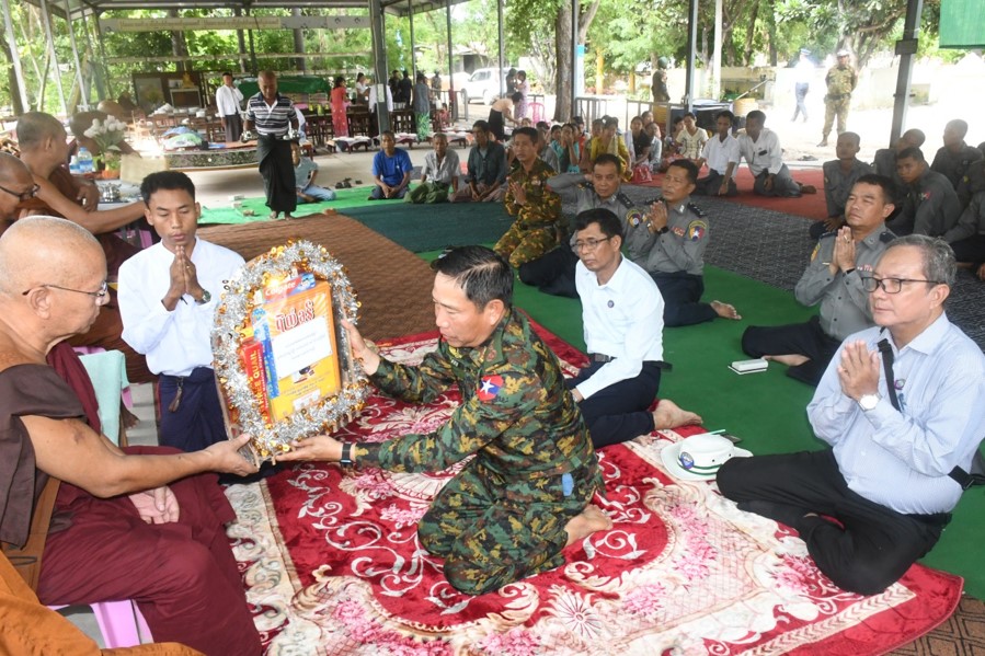ထို့ပြင်စစ်ကိုင်းမြို့၊ သောတပန်ရပ်ကွက်၊ ရွှေဟင်္သာတိုက်သစ်၌ ရွှေဟင်္သာတိုက်သစ်ဆရာတော် အရှင်သဒ္ဓမ္မအမှူးပြုသော သံဃာတော်အရှင်သူမြတ်များက ငလျင်ဒဏ်ကြောင့် ဘဝနတ်ထံပျံလွန်တော်မူသော ရဟန်း၊ သာမဏေ၊ သီလရှင်များနှင့် ကွယ်လွန်သွားကြသော လူပုဂ္ဂိုလ်များအတွက် သုံးလပြည့်ရည်စူးကုသိုလ်အမျှအတန်းပေးဝေပွဲသို့ ကာကွယ်ရေးဦးစီးချုပ်ရုံး(ကြည်း)မှ ဒုတိယဗိုလ်ချုပ်ကြီး သက်ပုံနှင့် စစ်ကိုင်းတိုင်းဒေသကြီးအစိုးရအဖွဲ့ဝင်များ၊ ခရိုင်/ မြို့နယ်အဆင့် ဌာနဆိုင်ရာဝန်ထမ်းများ၊ မြို့မိမြို့ဖများနှင့် ဒေသခံပြည်သူများ တက်ရောက်ကြပြီး ရွှေဟင်္သာတိုက်သစ်ဆရာတော်ထံမှ ငါးပါးသီလခံယူဆောက်တည်ကြသည်။ ထို့နောက် သံဃာတော်များ ရွတ်ပွားသရဇ္ဈာယ်တော်မူသော ပရိတ်တရားတော်များကို နာယူကြပြီး အလှူဖွယ်ဝတ္ထုများ ဆက်ကပ်လှုဒါန်းကြကာ ရေစက်သွန်းချ အမျှ ပေးဝေသည်။
