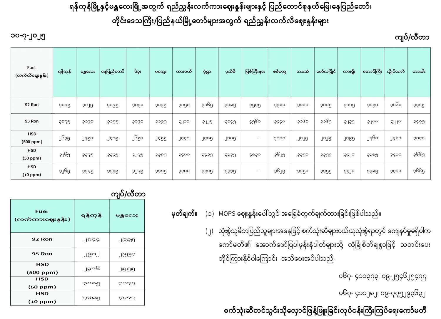 ရန်ကုန်မြို့နှင့် မန္တလေးမြို့အတွက် ရည်ညွှန်းလက်ကားဈေးနှုန်းများနှင့် ပြည်ထောင်စုနယ်မြေ နေပြည်တော်၊ တိုင်းဒေသကြီး/ပြည်နယ် မြို့တော်များအတွက် ရည်ညွှန်းလက်လီဈေးနှုန်းများ 07/10/2025
