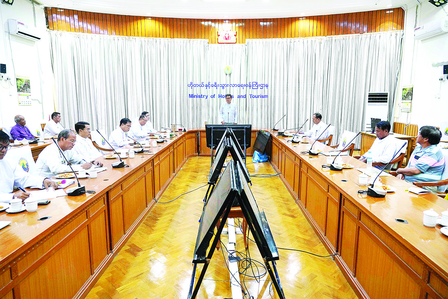 တွေ့ဆုံစဉ် ပြည်ထောင်စုဝန်ကြီးက ဟိုတယ်ဇုန်(၂)ရှိ ပြိုကျ ပျက်စီးနေသော အဆောက် အအုံများကို အမြန်ဆုံးဖယ်ရှား ရှင်းလင်းပြီးသတ်မှတ်ချက်များနှင့်အညီ ပြန်လည်တည်ဆောက် ပြုပြင်ရေးလုပ်ငန်းများ ဆောင်ရွက် ကြရမည်ဖြစ်ကြောင်း၊ ထိခိုက်ပျက်စီးမှုနည်းသော အပြာရောင် အဆင့် အဆောက်အအုံများကို ပြန်လည်ပြုပြင်မွမ်းမံ၍ ခရီးသွားရာသီကာလ ခရီးသွားများပိုမို ဝင်ရောက်လာချိန်မတိုင်မီ အဆင်သင့်ဖြစ်နေစေရေး ကြိုတင်ပြင်ဆင်ဆောင်ရွက်ကြရမည်ဖြစ်ကြောင်း၊ ဝန်ကြီးဌာနအနေဖြင့် ဟိုတယ်လုပ်ငန်းများ အမြန်ဆုံး ပြန်လည်လည်ပတ်နိုင်စေရေးအတွက် လိုအပ်သည်များ ကူညီပံ့ပိုးဆောင်ရွက်ပေးသွားမည်ဖြစ်ကြောင်း၊ ဟိုတယ်များအနေဖြင့် ဟိုတယ်နှင့် ဆက်စပ်လုပ်ငန်းများကိုသာ လိုင်စင်သတ်မှတ်ချက်နှင့်အညီ လုပ်ကိုင်ဆောင်ရွက်ကြရန်နှင့် မြို့တော်အင်္ဂါရပ်နှင့်အညီ သန့်ရှင်းသာယာလှပရေး ဆောင်ရွက်ကြရန် တိုက်တွန်းပြောကြားသည်။