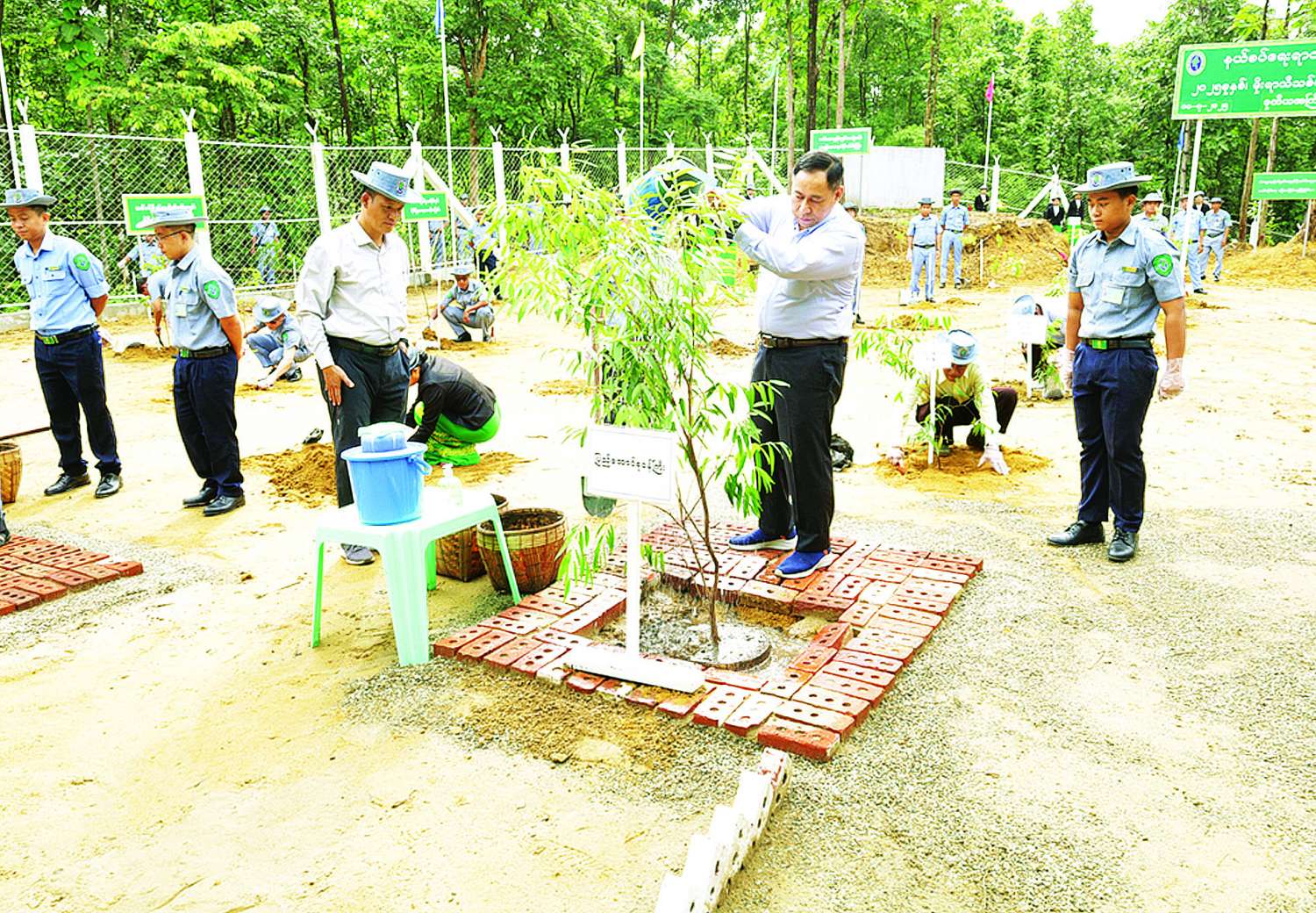 အခမ်းအနားတွင် နိုင်ငံတော်စီမံအုပ်ချုပ်ရေးကောင်စီအဖွဲ့ဝင်၊ နယ်စပ်ရေးရာဝန်ကြီးဌာန ပြည်ထောင်စုဝန်ကြီး ဒုတိယဗိုလ်ချုပ်ကြီး ရာပြည့်က ကံ့ကော်ပင်ကို ဦးဆောင်စိုက်ပျိုးပြီး ဒုတိယဝန်ကြီး ဗိုလ်ချုပ်ဖြိုးသန့်၊ ညွှန်ကြားရေးမှူးချုပ်များ၊ ဝန်ကြီးရုံးနှင့် ဦးစီးဌာနများမှ အရာထမ်း၊ အမှုထမ်းများက ရတနာတန်းဝင်ပင်များ၊ နှစ်ရှည်ပင်များ၊ အရိပ်ရလေကာပင်များ စုစုပေါင်း သစ်ပင် ၂၈၀ ကို စိုက်ပျိုးကြသည်။
