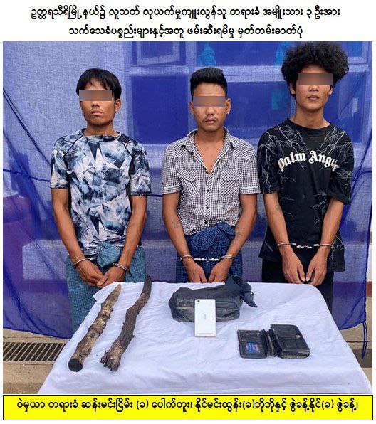 ပြည်ထောင်စုနယ်မြေ၊ နေပြည်တော်၊ ဥတ္တရသီရိမြို့နယ်၌ လူသတ်လုယက်မှုကျူးလွန်သူ တရားခံအမျိုးသား ၃ ဦးအား ဇူလိုင်လ ၁၉ ရက်နေ့က သက်သေခံပစ္စည်းများနှင့်အတူ ဖမ်းဆီးရမိခဲ့ကြောင်း သိရသည်။