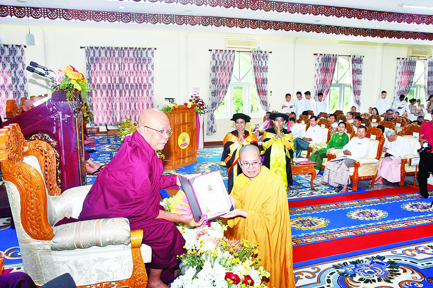 ယင်းနောက် ဝိဇ္ဇာဘွဲ့ (ဗုဒ္ဓဓမ္မ) တန်းမှ ပညာရည်ချွန်ထူးချွန်ဆုရရှိသော (Gold Medallist) ထူးချွန် ရွှေတံဆိပ်ဆုရှင် ဗီယက်နမ် (သီလရှင်) Nguyen Anh Tuyet အား ပါမောက္ခချုပ်ဆရာတော်က ချီးမြှင့်သည့် ရွှေစင်ရွှေပြားဆုတံဆိပ်ကို ပါမောက္ခ ချုပ်ဆရာတော်ကိုယ်စား ပြည်ထောင်စုဝန်ကြီးနှင့် ဇနီးတို့က ပေးအပ်ချီးမြှင့်ပြီး တက်ရောက်လာကြသော တာဝန်ရှိသူများနှင့် သံအမတ်ကြီးများကို ဒုတိယပါမောက္ခချုပ် (စီမံ) က အမှတ်တရ ဂုဏ်ပြုတံဆိပ်များ ပေးအပ်သည်။