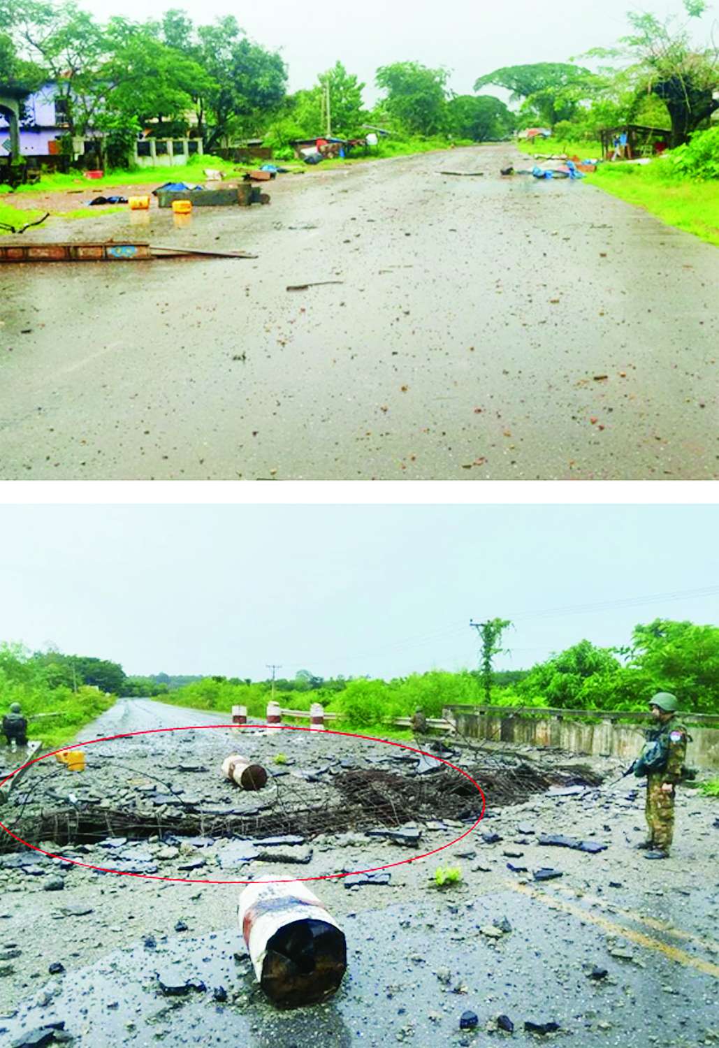 အကြမ်းဖက်သောင်းကျန်းသူများအနေဖြင့် ဖရိုဖရဲဖြင့် ဆုတ်ခွာထွက်ပြေးစဉ် ဆောင်ရွက်နေကျ ဖြစ်သည့် အဖျက်အမှောင့်လုပ်ငန်းများအား နည်းလမ်းမျိုးစုံဖြင့် လုပ်ဆောင်ခဲ့ပြီး မော်တော်ယာဉ်များအား မီးရှို့ဖျက်ဆီးခြင်း၊ ကားလမ်းများပေါ်၌ သစ်ပင်သစ်ကိုင်းများဖြင့် ကန့်လန့်ဖြတ် ပိတ်ဆို့ခြင်း၊ ကျုံဒိုးမြို့နှင့် ကော့ကရိတ်မြို့ကြားရှိ ညီညာသာလင်းတံတားနှင့် ၅ တိုင် တံတားအပါအဝင် အခြားလမ်း၊ တံတားများအား မိုင်းခွဲဖျက်ဆီး ခြင်းများ လုပ်ဆောင်ခဲ့ကြောင်း တွေ့ရှိရသည်။