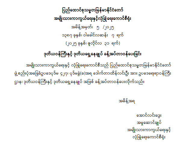 ဒုတိယဝန်ကြီးနှင့် ဒုတိယရှေ့နေချုပ် ခန့်အပ်တာဝန်ပေးခြင်း