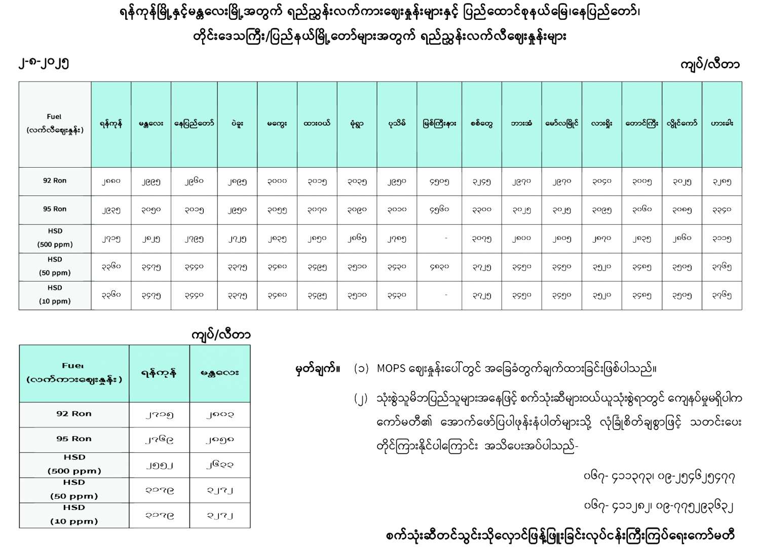 ရန်ကုန်မြို့နှင့် မန္တလေးမြို့အတွက် ရည်ညွှန်းလက်ကားဈေးနှုန်းများနှင့် ပြည်ထောင်စုနယ်မြေ နေပြည်တော်၊ တိုင်းဒေသကြီး/ပြည်နယ် မြို့တော်များအတွက် ရည်ညွှန်းလက်လီဈေးနှုန်းများ 08/02/2025