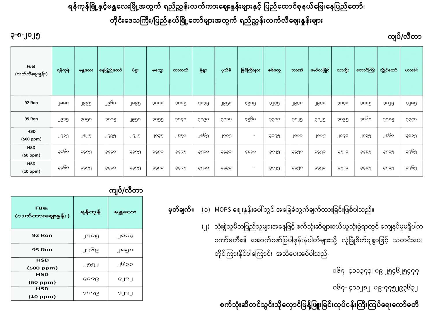 ရန်ကုန်မြို့နှင့် မန္တလေးမြို့အတွက် ရည်ညွှန်းလက်ကားဈေးနှုန်းများနှင့် ပြည်ထောင်စုနယ်မြေ နေပြည်တော်၊ တိုင်းဒေသကြီး/ပြည်နယ် မြို့တော်များအတွက် ရည်ညွှန်းလက်လီဈေးနှုန်းများ 08/03/2025