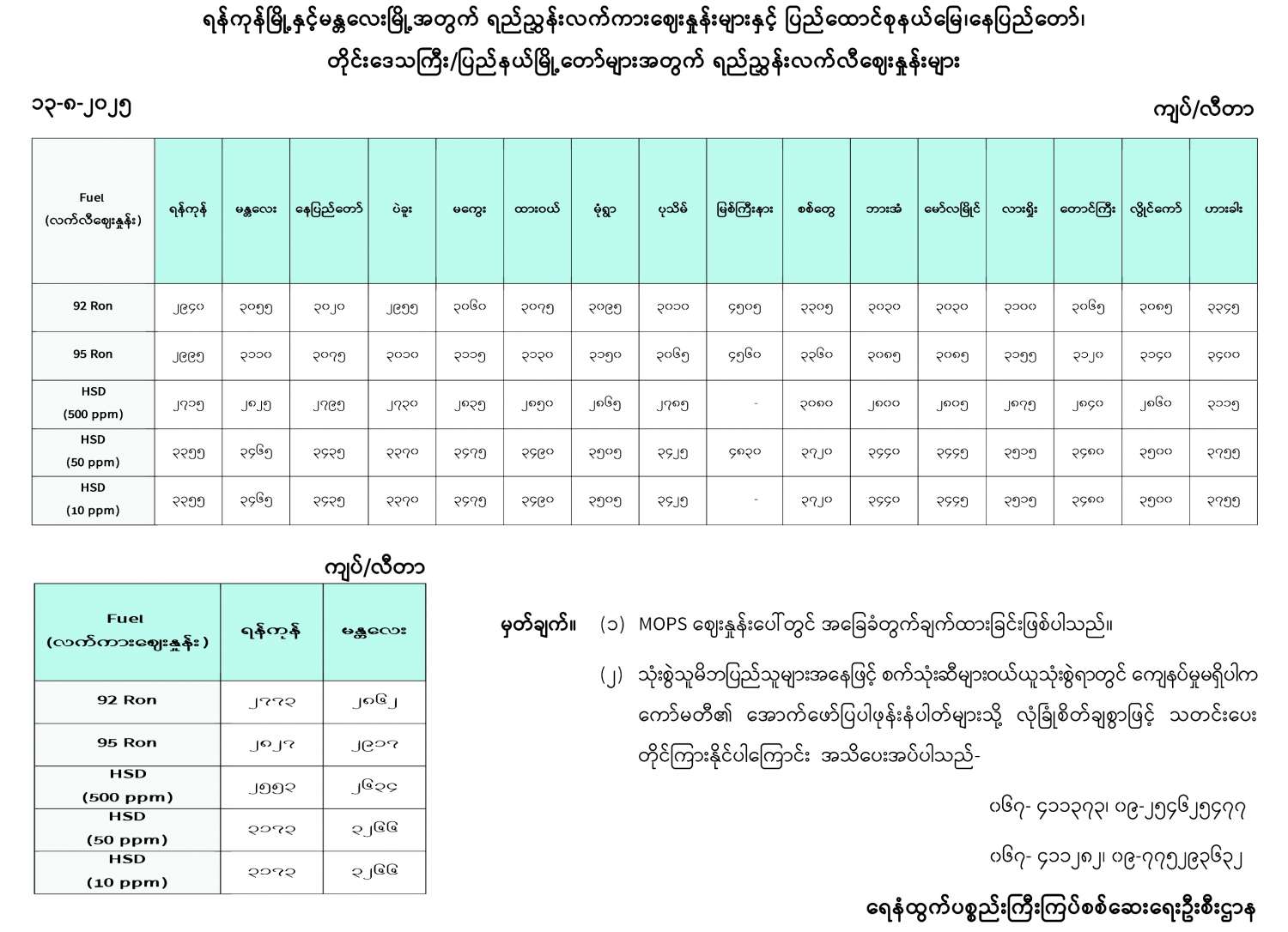ရန်ကုန်မြို့နှင့် မန္တလေးမြို့အတွက် ရည်ညွှန်းလက်ကားဈေးနှုန်းများနှင့် ပြည်ထောင်စုနယ်မြေ နေပြည်တော်၊ တိုင်းဒေသကြီး/ပြည်နယ် မြို့တော်များအတွက် ရည်ညွှန်းလက်လီဈေးနှုန်းများ 08/13/2025