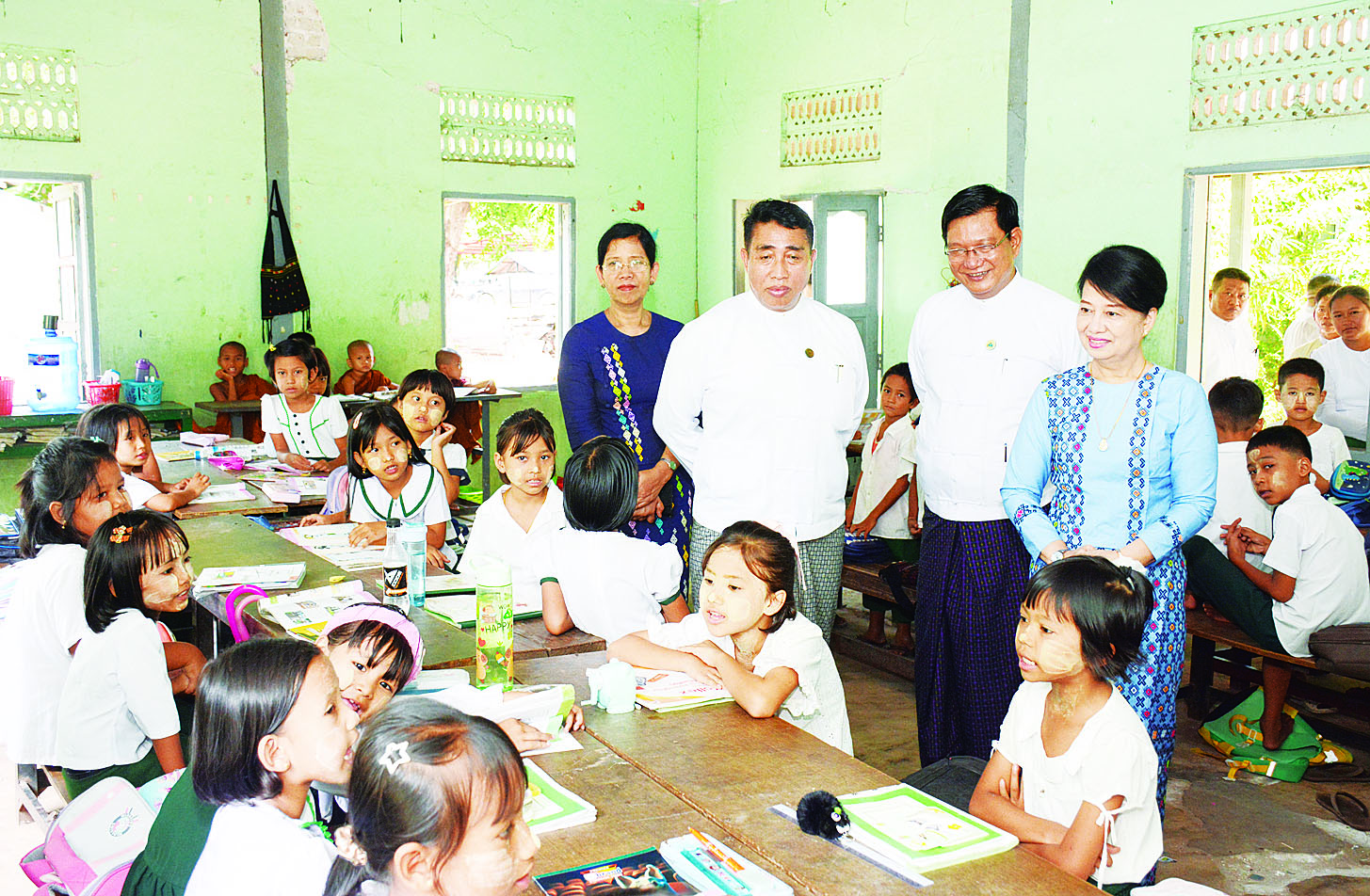 ထို့နောက် ကျောင်းအုပ်ကြီး၊ ဆရာဆရာမများနှင့်တွေ့ဆုံ၍ ကျောင်းသားကျောင်းသူများ လိမ္မာရေးခြားရှိရေး၊ မျိုးချစ်စိတ်၊ နိုင်ငံချစ်စိတ် မြင့်မားတိုးတက်စေရေးဆောင်ရွက်ရာတွင် ဆရာ ဆရာမများက စံနမူနာပြဆောင်ရွက်ကြရန်၊ ထိရောက်သည့် သင်ကြားသင်ယူမှုများ ဆောင်ရွက်နိုင်ရေး၊ သင်ထောက်ကူပစ္စည်းများအသုံးပြုရေးနှင့် လိုအပ်ချက်များရှိပါက ဖြည့်ဆည်းဆောင်ရွက်ပေးကြရန်၊ ဆရာဆရာမများအနေဖြင့် ကျောင်းသား ကျောင်းသူများ အမှန်တကယ်တတ်မြောက်အောင် သင်ကြားပေးကြရန်နှင့် စာဖတ်သည့်အလေ့အကျင့်ကောင်းများ ပျိုးထောင်ပေးကြစေလိုကြောင်း ပြောကြားသည်။