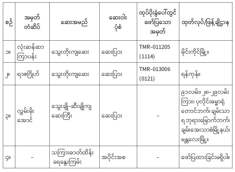 ၄။ တိုင်းရင်းဆေးဝါး ထုတ်လုပ်ဖြန့်ဖြူးသည့် လုပ်ငန်းများနှင့် ဆေးဝါးရောင်းချသည့် ဆေးဆိုင်များသည် တိုင်းရင်းဆေးပညာဦးစီးဌာနတွင် မှတ်ပုံတင်ထားခြင်းမရှိသော တိုင်းရင်းဆေးဝါးများ၊ ဆေးဝါးအတုများ၊ စံမညီတိုင်းရင်းဆေးဝါးများ၊ အများပြည်သူသုံးစွဲရန်မသင့်ကြောင်း ကြေညာထားသည့် တိုင်းရင်းဆေးဝါးများ တင်သွင်းဖြန့်ဖြူး ရောင်းချခြင်းများကို ကျင့်ဝတ် (Ethic) အရ လုံးဝ (လုံးဝ)မပြုလုပ်ရန်နှင့် လိုက်နာဆောင်ရွက်ခြင်း မရှိပါက တိုင်းရင်းဆေးဝါးဥပဒေပုဒ်မ (၃၁)၊ (၃၂) အရ တရားစွဲဆိုအရေးယူမည်ဖြစ်ကြောင်း အသိပေး အပ်ပါသည်။