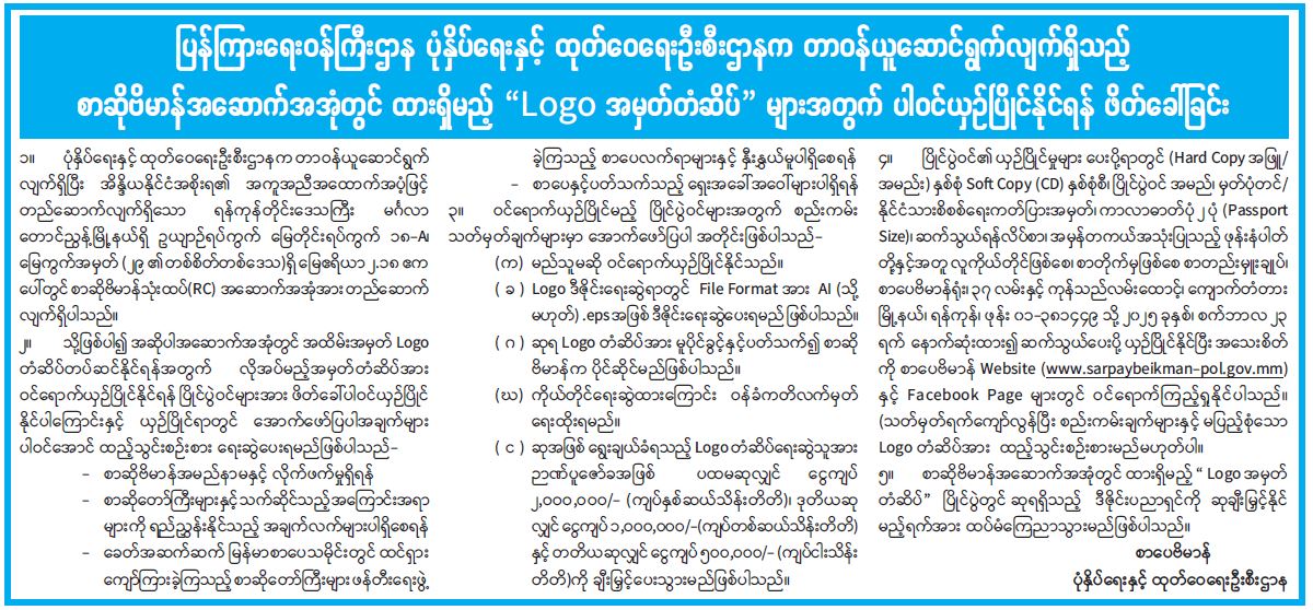 ပြန်ကြားရေးဝန်ကြီးဌာန ပုံနှိပ်ရေးနှင့် ထုတ်ဝေရေးဦးစီးဌာနက တာဝန်ယူဆောင်ရွက်လျက်ရှိသည့် စာဆိုဗိမာန်အဆောက်အအုံတွင် ထားရှိမည့် “Logo အမှတ်တံဆိပ်” များအတွက် ပါဝင်ယှဉ်ပြိုင်နိုင်ရန် ဖိတ်ခေါ်ခြင်း 09/12/2025
