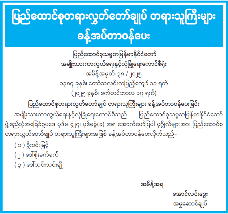 ပြည်ထောင်စုတရားလွှတ်တော်ချုပ် တရားသူကြီးများ ခန့်အပ်တာဝန်ပေးခြင်း