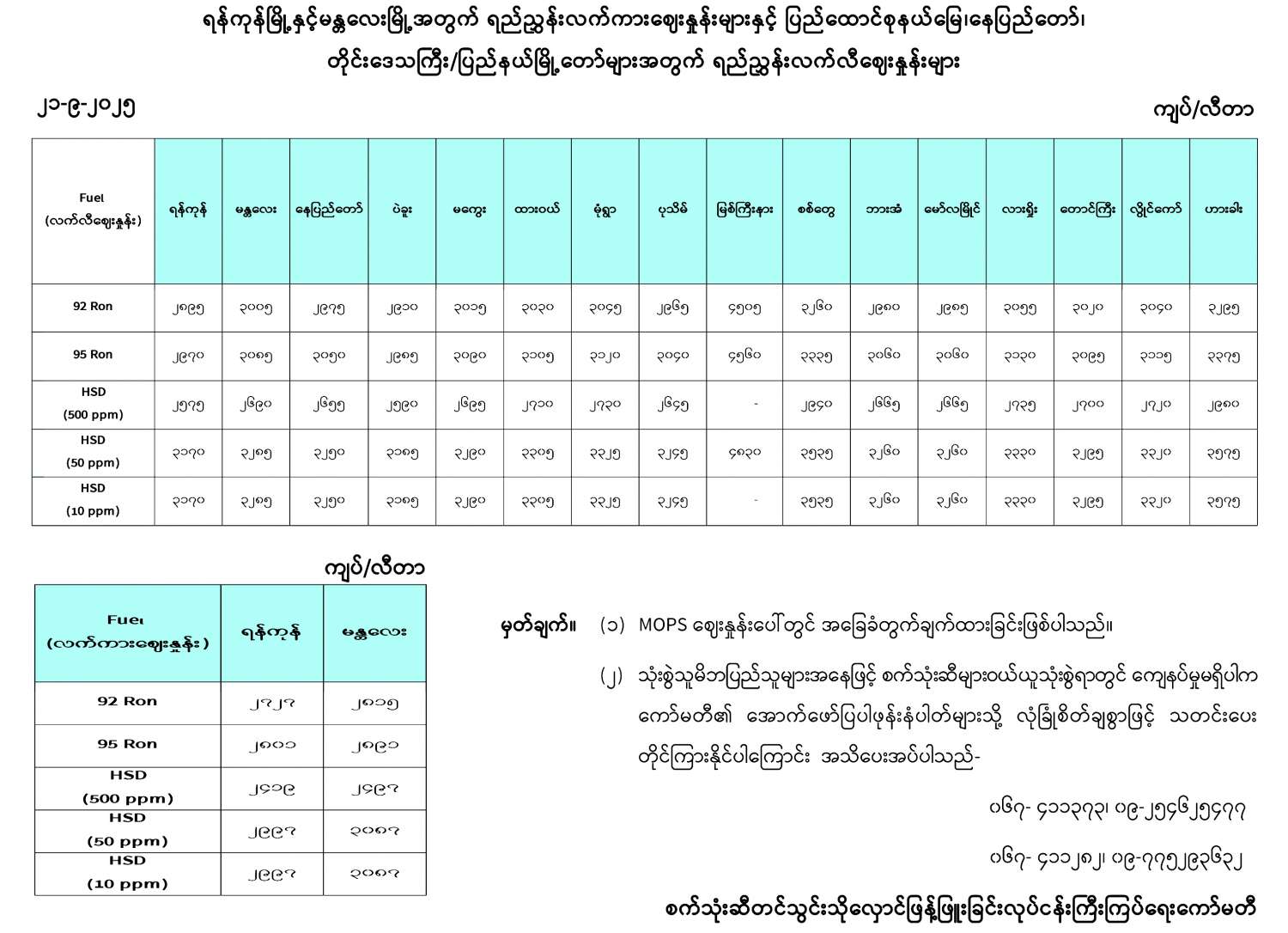 ရန်ကုန်မြို့နှင့် မန္တလေးမြို့အတွက် ရည်ညွှန်းလက်ကားဈေးနှုန်းများနှင့် ပြည်ထောင်စုနယ်မြေ နေပြည်တော်၊ တိုင်းဒေသကြီး/ပြည်နယ် မြို့တော်များအတွက် ရည်ညွှန်းလက်လီဈေးနှုန်းများ 09/21/2025