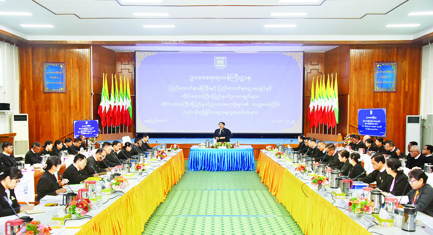 ပါတီစုံအထွေထွေ ရွေးကောက် ပွဲကို ဒီဇင်ဘာ ၂၈ ရက်နေ့တွင် ကျင်းပမည်ဖြစ်သည့်အတွက် ဥပဒေရုံးအဆင့်ဆင့်ရှိ ဥပဒေ အရာရှိများအနေဖြင့် အသစ်ပြင်ဆင်ပြဋ္ဌာန်းခဲ့သည့် လွှတ်တော် သုံးရပ်ဆိုင်ရာ ရွေးကောက်ပွဲဥပဒေ များကို ကျေညက်စွာ လေ့လာထား ရန်လိုအပ်ကြောင်း၊ ဥပဒေရုံးအဆင့်ဆင့်ရှိ ဥပဒေအရာရှိများအနေဖြင့် ပြည်ထောင်စု ရွေးကောက်ပွဲကော်မရှင် ဥပဒေ ဖြင့် ဥပဒေအကြံပြုချက် တောင်းခံသည့်အမှုများကို ဥပဒေအကြံပြု ပြန်ကြားရာတွင် သက်ဆိုင်ရာ ဥပဒေပြဋ္ဌာန်းချက်များကို ပြည့်စုံစွာကိုးကား၍ အကြံပြုပြန်ကြားရန် လိုအပ်ကြောင်း ပြောကြားခဲ့သည်။