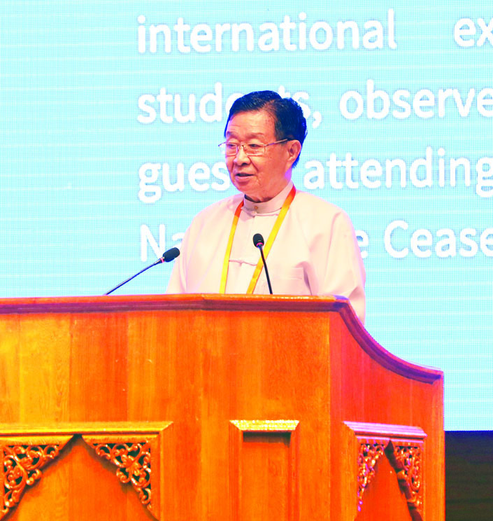 တစ်နိုင်ငံလုံးပစ်ခတ်တိုက်ခိုက်မှုရပ်စဲရေးသဘောတူစာချုပ်(NCA) (၁၀) နှစ်ပြည့် နှစ်ပတ်လည်နေ့အခမ်းအနားတွင် NCA တွင်ပါဝင်လက်မှတ်ရေးထိုးသူ ဦးအောင်မင်း ပြောကြားသည့် ဂုဏ်ပြုစကား