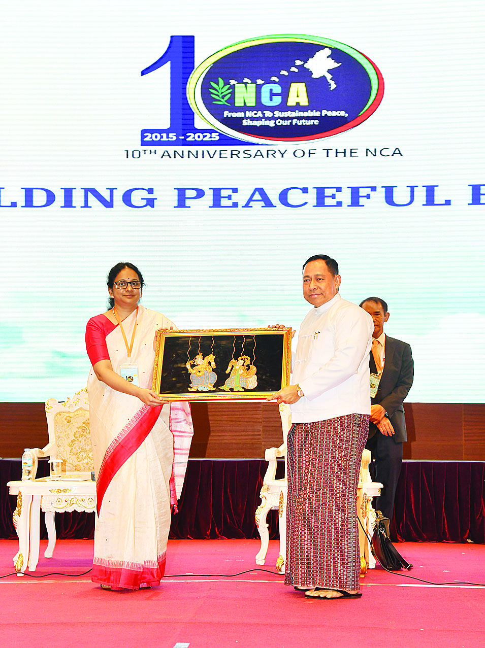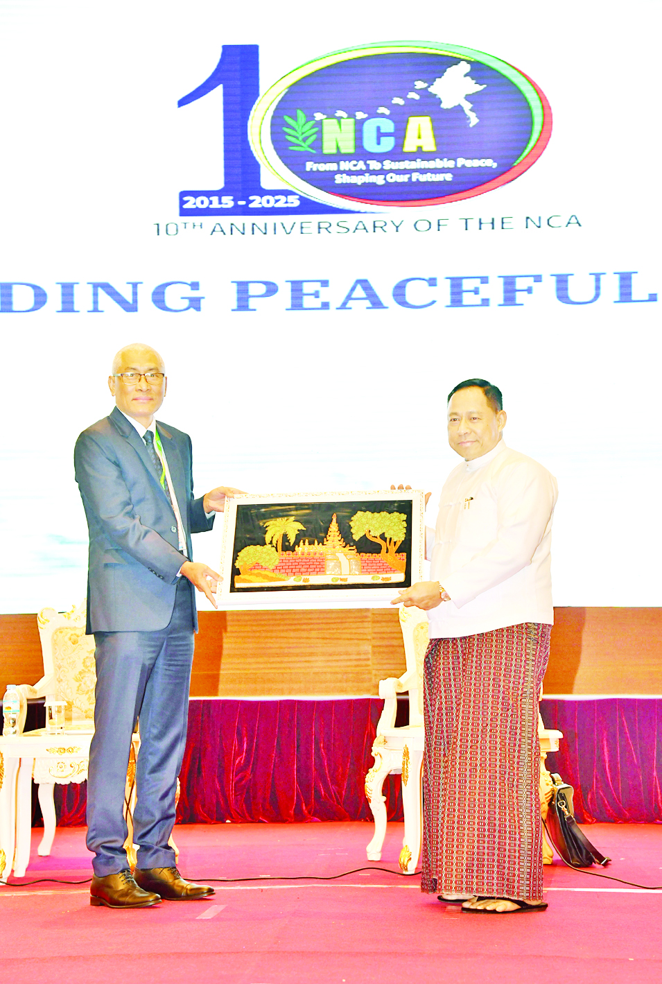 တစ်နိုင်ငံလုံးပစ်ခတ်တိုက်ခိုက်မှုရပ်စဲရေးသဘောတူစာချုပ် (NCA)(၁၀)နှစ်ပြည့်နှစ်ပတ်လည်နေ့အထိမ်းအမှတ်အစီအစဉ်အဖြစ် “ငြိမ်းချမ်းသော မြန်မာ့အနာဂတ်တည်ဆောက်ခြင်း” အလုပ်ရုံဆွေးနွေးပွဲကို နေပြည်တော်ရှိ မြန်မာအပြည်ပြည်ဆိုင်ရာကွန်ဗင်းရှင်းဗဟိုဌာန(၁)ကျောက်စိမ်းခန်းမ၌ ဆက်လက်ကျင်းပသည်။
