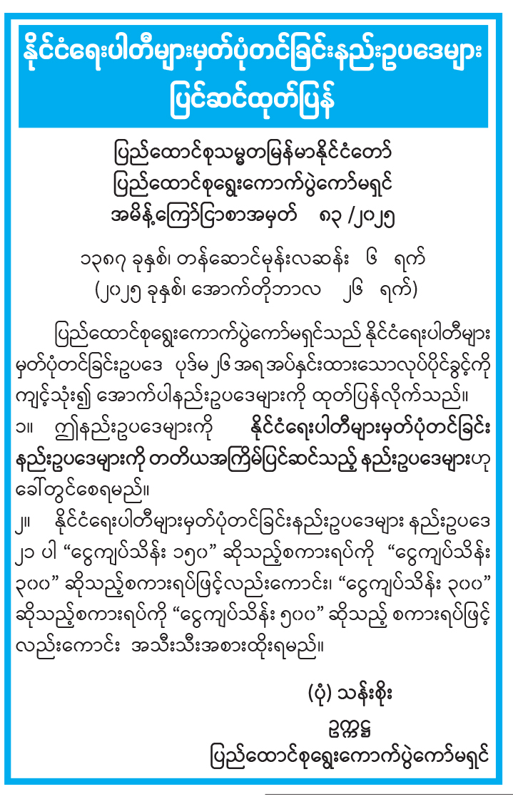 နိုင်ငံရေးပါတီများမှတ်ပုံတင်ခြင်းနည်းဥပဒေများ ပြင်ဆင်ထုတ်ပြန်