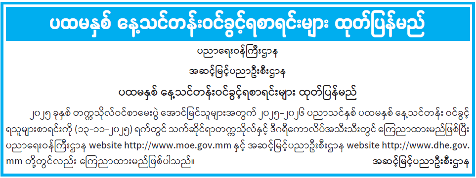 ပထမနှစ် နေ့သင်တန်း ဝင်ခွင့်ရစာရင်းများ ထုတ်ပြန်မည်