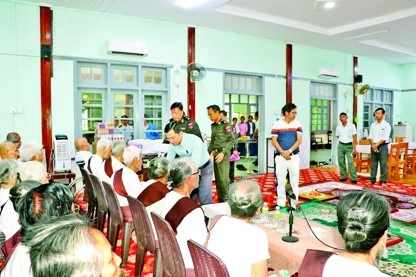ထို့နောက် ပြည်ထောင်စုဝန်ကြီးသည် ဘိုးဘွားရိပ်သာအတွက် ဆိုလာမီးများနှင့် စားသောက်ဖွယ်ရာများ ပေးအပ်လှူဒါန်းပြီး အဘိုးအဘွားများ၏ နိုင်ငံသားစိစစ်ရေးကတ်ပြား ရရှိကိုင်ဆောင်မှုနှင့် မဲပေးပိုင်ခွင့်မဆုံးရှုံးစေရေးအတွက် ဆောင်ရွက်ပေးရန်ရှိပါက ဆွေးနွေးပြောကြားနိုင်ရေးမှာကြား၍ အဘိုးအဘွားများကို အားပေးစကားပြောကြားခဲ့ကြောင်း သိရသည်။