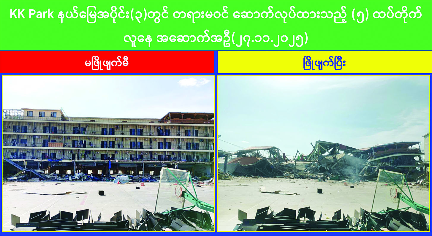 ထိုသို့ အွန်လိုင်းလိမ်လည်မှုများနှင့် အွန်လိုင်းလောင်းကစားမှုတိုက်ဖျက်ရေး လုပ်ငန်းများဆောင်ရွက်ရာတွင် မြဝတီ-မဲ့ထော်သလေး (KK Park) နယ်မြေအတွင်း ရှိ အွန်လိုင်းလိမ်လည်လောင်းကစားမှု များ ကျူးလွန်ရာတွင် အသုံးပြုခဲ့သည့် အဆောက်အအုံများကို အပိုင်း(၃)ပိုင်းခွဲ၍ စနစ်တကျ ဖြိုချဖျက်ဆီးခြင်းများ ဆောင်ရွက်လျက်ရှိရာ ယနေ့တွင် အပိုင်း (၃) နယ်မြေအတွင်းရှိ တရားမဝင် အဆောက်အအုံ ၁၀ လုံးကို ထပ်မံဖြိုချ ဖျက်ဆီးခဲ့သဖြင့် အပိုင်း (၃) နယ်မြေ အတွင်းရှိ အဆောက်အအုံ ၄၂၅ လုံးအနက် ယနေ့အထိ ၁၀၈ လုံး ဖြိုချဖျက်ဆီး ခဲ့ကြောင်းနှင့် KK Park နယ်မြေအတွင်းရှိ တရားမဝင်အဆောက်အအုံ စုစုပေါင်း ၆၃၅ လုံး အနက် ၂၅၆ လုံးကို ဖြိုချဖျက်ဆီးပြီးဖြစ်ကြောင်း သိရှိရသည်။