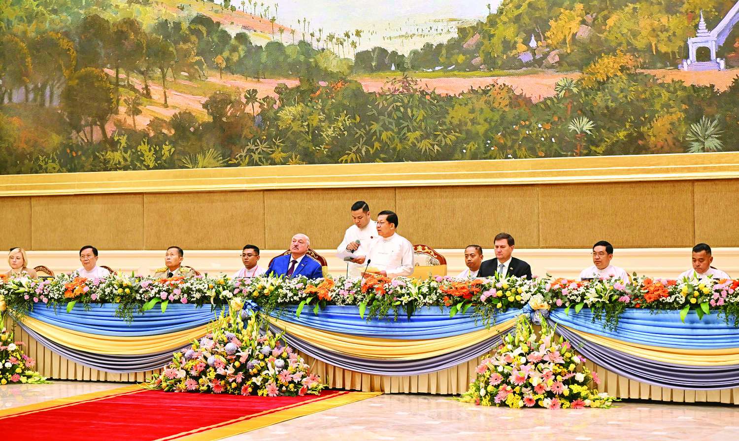 ထို့နောက် ဘယ်လာရုစ်သမ္မတနိုင်ငံသမ္မတက ပြန်လည်ဆွေးနွေးပြောကြားရာတွင် မိမိနှင့်ချစ်ကြည်ရေးကိုယ်စားလှယ်အဖွဲ့ဝင်များအား နွေးထွေးစွာဖြင့် ကြိုဆို သည့်အတွက်လှိုက်လှိုက်လှဲလှဲကျေးဇူးတင်ရှိပါကြောင်း၊ မိမိအနေဖြင့် မြန်မာနိုင်ငံသို့ ပထမဆုံးလာရောက်သည့် ခရီးစဉ်ဖြစ်သည့်အတွက် ဝမ်းမြောက်ဂုဏ်ယူမိသည်ကို ပြောကြားလိုကြောင်း၊ အဆွေတော်အနေဖြင့် မတ်လအတွင်း ဘယ်လာရုစ်နိုင်ငံသို့ တရားဝင်ချစ်ကြည်ရေးခရီးစဉ်လာရောက်ခဲ့မှုသည်လည်း မြန်မာနိုင်ငံမှ နိုင်ငံတော်အကြီးအကဲတစ်ဦး၏ ပထမဆုံးချစ်ကြည်ရေးခရီးစဉ်ဖြစ်ပါကြောင်း၊ ယခုနှစ်အတွင်း မိမိတို့နှစ်ဦးအနေဖြင့် ၆ ကြိမ်တွေ့ဆုံခဲ့ပြီးဖြစ်ကြောင်း၊ ထို့ကြောင့် ၂၀၂၅ ခုနှစ်သည် နှစ်နိုင်ငံအတွက် အမှတ်တရများ များစွာရှိပြီး နှစ်နိုင်ငံအကြား သမိုင်းအသစ်များ စိုက်ထူနိုင်သည့် နှစ်တစ်နှစ်ဖြစ်ပါကြောင်း၊ နှစ်နိုင်ငံအကြား ပူးပေါင်းဆောင်ရွက်မှုများကို အောင်အောင်မြင်မြင် လုပ်ဆောင်လျက်ရှိကြောင်း၊ မင့်စ်မြို့တွင် ကျင်းပခဲ့သည့် EAEU အစည်းအဝေးသို့ မြန်မာနိုင်ငံမှ နိုင်ငံခြားရေးဝန်ကြီးဦးဆောင်၍ တက်ရောက်ခဲ့ကြောင်း၊ ယခုနှစ်အတွင်း မိမိတို့အနေဖြင့် နိုင်ငံတကာအခမ်းအနားများ၊ နိုင်ငံတကာအစည်းအဝေးများတွင် တွေ့ဆုံဆွေးနွေးမှုများ များစွာပြုလုပ်နိုင်ခဲ့ကြောင်း၊ ထိုသို့တွေ့ဆုံချိန်တွင် အပြန်အလှန်ကူညီရေးဆိုင်ရာများကို ဆွေးနွေးနိုင်ခဲ့ကြောင်း၊ မိမိတို့နိုင်ငံအနေဖြင့် မြန်မာနိုင်ငံနှင့်ပတ်သက်ပြီး အမြဲတံခါးဖွင့်ထားပါကြောင်း၊ မြန်မာနိုင်ငံနှင့် ပူးပေါင်းဆောင်ရွက်မှုများ ဆောင်ရွက်ချိန်တွင် မည်သည့်ပြင်ပနှောင့်ယှက်စွက်ဖက်မှုများရှိနေပါစေ တစ်စိုက်မတ်မတ်ဖြင့် ဆက်လက်ပူးပေါင်းဆောင်ရွက်သွားမည်ကို ပြောကြားလိုပါကြောင်း၊ မိမိတို့နိုင်ငံမှ တာဝန်ရှိသည့်ဝန်ကြီးများ၊ မြန်မာနိုင်ငံမှ တာဝန်ရှိသည့် ဝန်ကြီးများ ပူးပေါင်း၍ စီးပွားရေးဖိုရမ်များကျင်းပခဲ့ပြီး တွေ့ဆုံဆွေးနွေးမှုများ ပြုလုပ်ခဲ့ပါကြောင်း၊ ထိုမှတစ်ဆင့် နှစ်နိုင်ငံပူးပေါင်းဆောင်ရွက်မှုများ အောင်မြင်စေရေးနှင့် ရလဒ်ကောင်းများ ရရှိစေရေးဆွေးနွေးဆောင်ရွက်နိုင်ခဲ့ပါကြောင်း၊ မိမိတို့အနေဖြင့် ယနေ့တွင် နှစ်နိုင်ငံပူးပေါင်းဆောင်ရွက်မှုမြှင့်တင်ရေးဆိုင်ရာ လမ်းပြမြေပုံ (၂၀၂၆-၂၀၂၈) ကိုလက်မှတ်ရေးထိုးသွားမည်ဖြစ်ပါကြောင်း၊ အဆိုပါလမ်းပြမြေပုံ၌ နှစ်နိုင်ငံပူးပေါင်းဆောင်ရွက်ရေးနှင့်ပတ်သက်သည့် အချက်များစွာ ပါဝင်ကြောင်း၊ အဆိုပါလမ်းပြမြေပုံအတိုင်း ဆောင်ရွက်သွားမည်ဆိုပါက နှစ်နိုင်ငံ စီးပွားရေးဆိုင်ရာ ပူးပေါင်းဆောင်ရွက်မှုများ ပိုမိုအောင်မြင်နိုင်မည်ဖြ