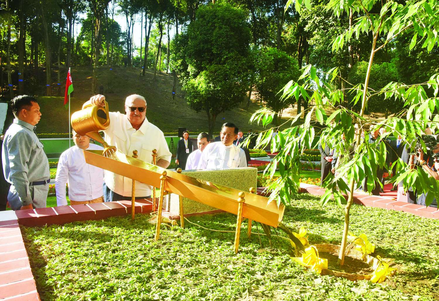 ယင်းနောက် ဘယ်လာရုစ်သမ္မတနိုင်ငံသမ္မတ၊ ပြည်ထောင်စုသမ္မတမြန်မာနိုင်ငံတော်ယာယီသမ္မတနှင့် အဖွဲ့ဝင်များသည် ဘယ်လာရုစ်-မြန်မာအထိမ်းအမှတ် ကံ့ကော်ပင်ရှေ့၌ စုပေါင်းမှတ်တမ်းတင်ဓာတ်ပုံရိုက်ကြပြီး အမျိုးသားပရဆေးဥယျာဉ်အတွင်းရှိ အာဆီယံနှင့် BIMSTEC ဘင်းစတက်အဖွဲ့ဝင် နိုင်ငံ့အကြီးအကဲများ စိုက်ပျိုးခဲ့သည့် အထိမ်းအမှတ်သစ်ပင်များကို လှည့်လည်ကြည့်ရှုခဲ့ကြကြောင်း သတင်းရရှိသည်။
