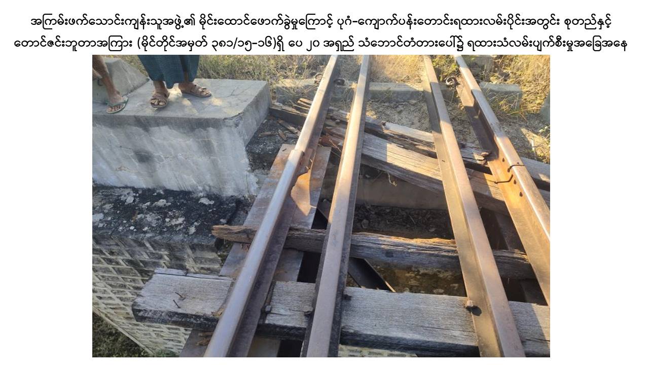 မန္တလေးတိုင်းဒေသကြီး၊ ညောင်ဦးမြို့နယ်၊ ပုဂံ-ကျောက်ပန်းတောင်းလမ်းပိုင်းအတွင်း စုတည်ဘူတာနှင့် တောင်ဇင်းဘူတာအကြား သံလမ်းပြေးယာဉ် RGC 103 ဖြင့် ရထားလမ်းပိုင်းအား ယနေ့နံနက် ၈ နာရီ ၅၀ မိနစ်ခန့်တွင် သွားရောက်စစ်ဆေးစဉ် မိုင်တိုင် ၃၈၁/၁၅-၁၆ ကြား ပေ ၂၀ အရှည်ရှိ သံဘောင်တံတားအမှတ် ၁၅၇ အနီးတွင် အကြမ်းဖက်သောင်းကျန်းသူအဖွဲ့က မိုင်းထောင်ဖောက်ခွဲဖျက်ဆီးခဲ့သဖြင့် ရထားသံလမ်းအရှေ့ဘက်ခြမ်း သံလမ်းဖိနပ် ၁ ပေခန့် ပဲ့ထွက်ပျက်စီးခြင်းနှင့် ဇလီဖား(၃)တုံး ကျိုးပဲ့နေကြောင်းတွေ့ရှိရသဖြင့် စုတည်-တောင်ဇင်း ရထားလမ်းပိုင်းအား နံနက် ၁၀ နာရီ ၁၆ မိနစ်ခန့်တွင် ယာယီပိတ်ထားခဲ့ကြောင်း သိရှိရသည်။