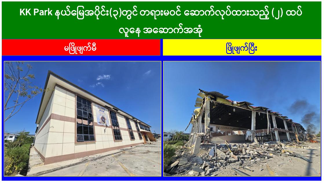 ယနေ့တွင် မြဝတီ-မဲထော်သလေး (KK Park) အပိုင်း(၃)နယ်မြေအတွင်းရှိ တရားမဝင်အဆောက်အအုံများဖြစ်သော ၂ ထပ်အဆောက်အအုံ ၁ လုံး၊ ၃ ထပ်အဆောက်အအုံ ၂ လုံး၊ ၄ ထပ်အဆောက်အအုံ ၁ လုံး၊ စုစုပေါင်း တရားမဝင်အဆောက်အအုံ ၄ လုံးကို ထပ်မံဖြို ချဖျက်ဆီးခဲ့သဖြင့် အပိုင်း(၃)နယ်မြေအတွင်းရှိ အဆောက်အအုံ ၄၂၅ လုံးအနက် ယနေ့အထိ ၁၄၉ လုံး ဖြိုချဖျက်ဆီးခဲ့ကြောင်းနှင့် KK Park နယ်မြေအတွင်းရှိ တရားမဝင် အဆောက်အအုံ စုစုပေါင်း ၆၃၅ လုံးအနက် ၂၉၇ လုံးကို ဖြိုချဖျက်ဆီးပြီးဖြစ်ကြောင်း သိရှိရသည်။