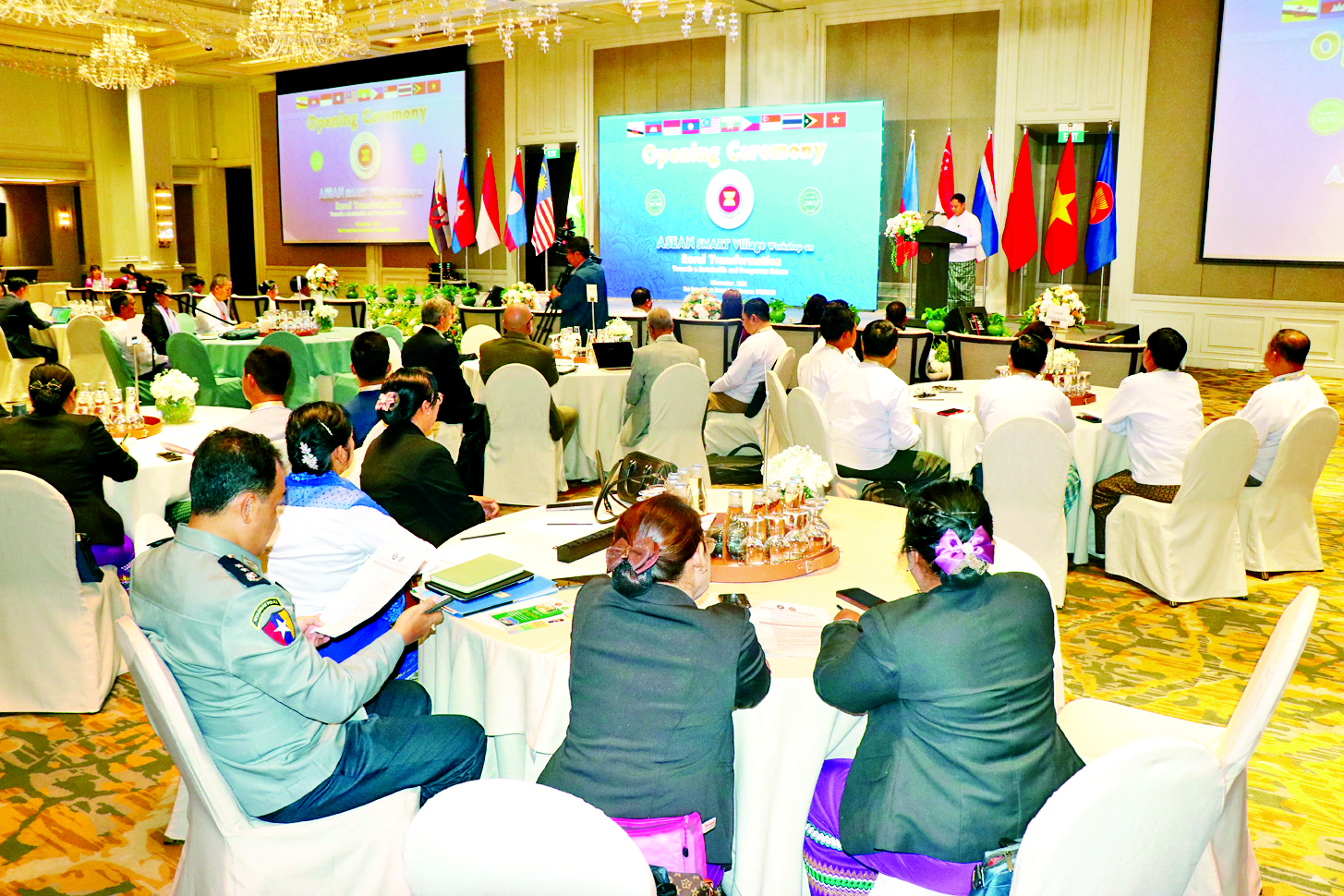 အသိပညာမျှဝေမှုကိုမြှင့်တင်ရန်၊ ဒေသတွင်းပူးပေါင်းဆောင်ရွက်မှုကိုအားပေးရန်နှင့် အာဆီယံတစ်ဝန်းလွှမ်းခြုံနိုင်သည့် ရေရှည်တည်တံ့သော ကျေးလက်ဒေသအသွင်ကူးပြောင်းမှုကို အရှိန်မြှင့်တင်နိုင်ရေးအတွက် သမဝါယမနှင့်ကျေးလက်ဖွံ့ဖြိုးရေးဝန်ကြီးဌာန ကျေးလက်ဒေသဖွံ့ဖြိုးတိုးတက်ရေးဦးစီးဌာနက အိမ်ရှင်အဖြစ်လက်ခံကျင်းပသည့် အာဆီယံဒေသတွင်း ခေတ်မီစံပြကျေးရွာများ ထူထောင်ခြင်းမှတစ်ဆင့် ကျေးလက်ဒေသအသွင်ကူးပြောင်းခြင်း အလုပ်ရုံဆွေးနွေးပွဲကို ယနေ့နံနက်ပိုင်းက ရန်ကုန်မြို့ THE ERAVATI SULE GRAND ဟိုတယ်ရှိ Grand Ballroom ၌ ကျင်းပသည်။