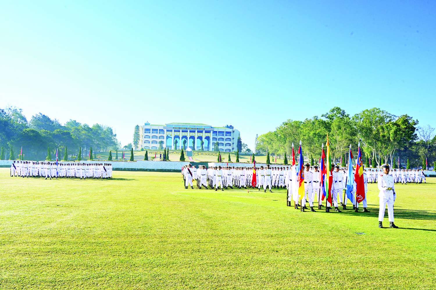 တပ်မတော်နည်းပညာတက္ကသိုလ် ဗိုလ်လောင်းသင်တန်းအမှတ်စဉ် (၂၇) သင်တန်းဆင်းဂုဏ်ပြုစစ်ရေးပြအခမ်းအနားကို ယနေ့နံနက်ပိုင်းတွင် ပြင်ဦးလွင်မြို့၊ တပ်မတော်နည်းပညာတက္ကသိုလ် စစ်ရေးပြကွင်း၌ ကျင်းပပြုလုပ်ရာ နိုင်ငံတော်လုံခြုံရေးနှင့် အေးချမ်းသာယာရေးကော်မရှင်ဥက္ကဋ္ဌ တပ်မတော်ကာကွယ်ရေးဦးစီးချုပ် ဗိုလ်ချုပ်မှူးကြီး သတိုးမဟာသရေစည်သူ သတိုးသီရိသုဓမ္မ မင်းအောင်လှိုင် တက်ရောက်မိန့်ခွန်းပြောကြားသည်။