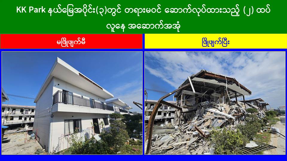 ယနေ့တွင် မြဝတီ-မဲထော်သလေး (KK Park) အပိုင်း (၃) နယ်မြေအတွင်းရှိ တရားမဝင်အဆောက်အအုံများဖြစ်သော ၂ ထပ်အဆောက်အအုံ ၁၀ လုံး၊ ၄ ထပ် အဆောက်အအုံ ၁ လုံး၊ စုစုပေါင်း တရားမဝင်အဆောက်အအုံ ၁၁ လုံးကို ထပ်မံဖြိုချဖျက်ဆီးခဲ့သဖြင့် အပိုင်း (၃) နယ်မြေအတွင်းရှိ အဆောက်အအုံ ၄၂၅ လုံးအနက် ယနေ့အထိ ၁၆၀ လုံး ဖြိုချဖျက်ဆီးခဲ့ကြောင်းနှင့် KK Park နယ်မြေအတွင်းရှိ တရားမဝင်အဆောက်အအုံ စုစုပေါင်း ၆၃၅ လုံးအနက် ၃၀၈ လုံးကို ဖြိုချဖျက်ဆီးပြီးဖြစ်ကြောင်း သိရှိရသည်။