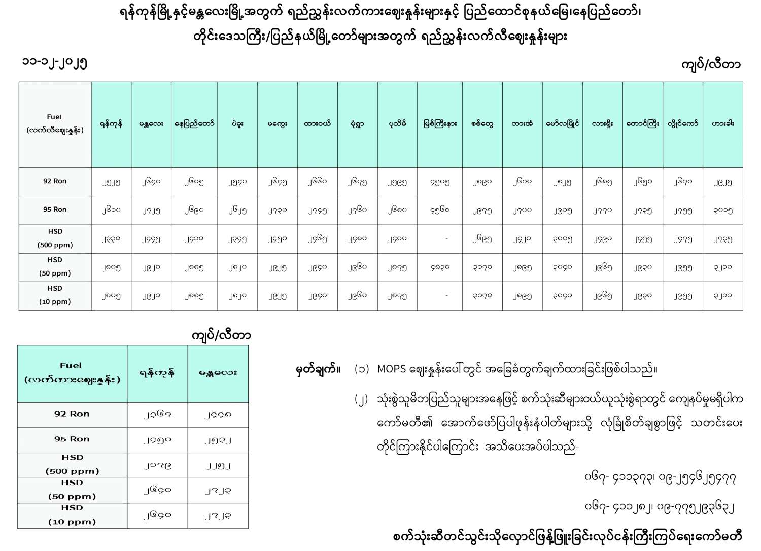 ရန်ကုန်မြို့နှင့် မန္တလေးမြို့အတွက် ရည်ညွှန်းလက်ကားဈေးနှုန်းများနှင့် ပြည်ထောင်စုနယ်မြေ နေပြည်တော်၊ တိုင်းဒေသကြီး/ပြည်နယ် မြို့တော်များအတွက် ရည်ညွှန်းလက်လီဈေးနှုန်းများ 12/11/2025
