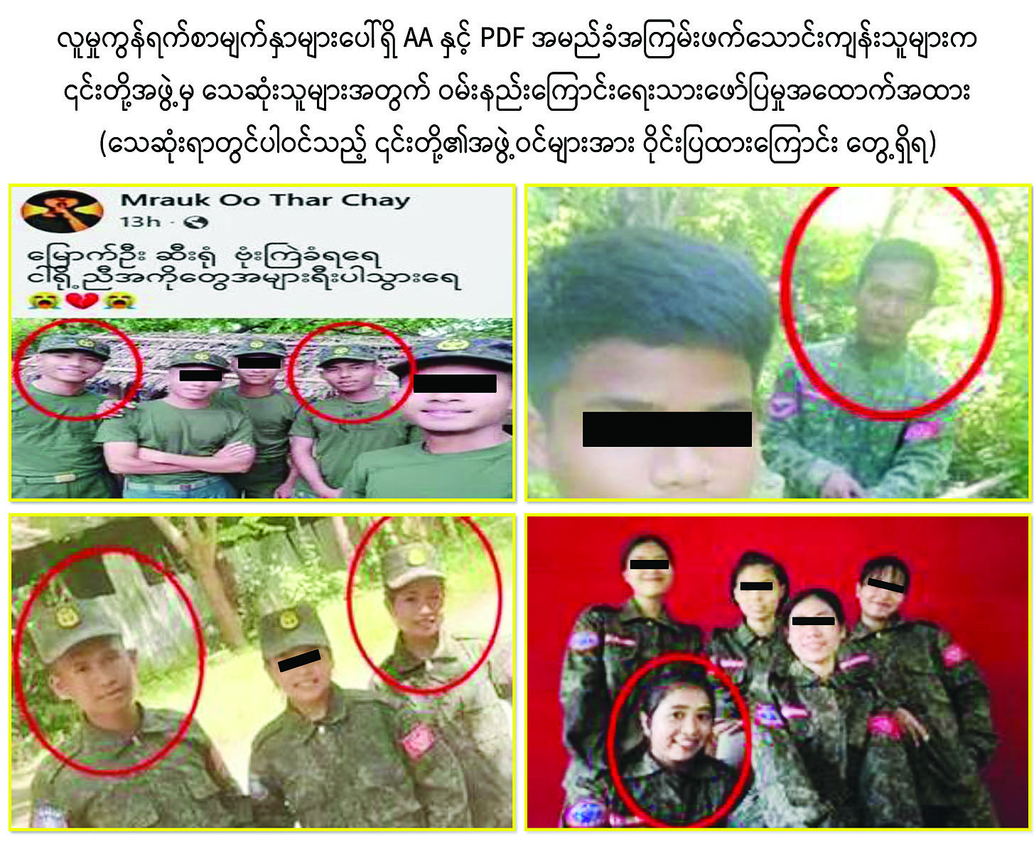 လူမှုကွန်ရက်စာမျက်နှာများပေါ်ရှိ ၎င်းအကြမ်းဖက်သောင်းကျန်းသူများ ရေးသားဖြန့်ဝေထားသည့် ဓာတ်ပုံအထောက်အထားများအရ ၎င်းတို့အဖွဲ့မှ ဒဏ်ရာရရှိသူများအား ဘေးလွတ်ရာသို့ ရွှေ့ပြောင်းပေးနေမှု၊ သေဆုံးသူများအတွက် ဝမ်းနည်းကြောင်း ရေးသားဖော်ပြမှုများကို တွေ့ရှိ ရပြီး အထက်ပါဖြစ်စဉ်တွင် သေဆုံး၊ ဒဏ်ရာရရှိ သူများမှာ ပြည်သူများမဟုတ်ဘဲ AA ၊ BPLA ၊ ဒေသခံ PDF၊ အရှိုချင်း စသည့် အကြမ်းဖက်သောင်းကျန်းသူများအနေဖြင့် စစ်စခန်းအဖြစ် အခြေပြုနေသောနေရာအတွင်း လိုအပ်သော အုပ်ချုပ်မှုကိစ္စရပ်များ ဆောင်ရွက်ရန်အတွက် ဒေသခံ AA အကြမ်းဖက်သောင်းကျန်းသူများ၏ ယုံကြည်စိတ်ချရသော မိသားစုဝင်များကို တာဝန် ပေးထားသူများအပြင် ၎င်းတို့ကိုထောက်ခံအားပေးသည့် အမာခံများသာဖြစ်သည်ဟု သိရှိရကြောင်းနှင့် တပ်မတော်အနေဖြင့် လိုအပ်သည့်အကြမ်းဖက် ချေမှုန်းရေးစစ်ဆင်ရေးကို (Rules of Engagement- ROE)နှင့်အညီ လိုအပ်သလို ဆက်လက်ဆောင်ရွက်သွားမည်ဖြစ်ကြောင်း သတင်းထုတ်ပြန်အပ်ပါသည်။