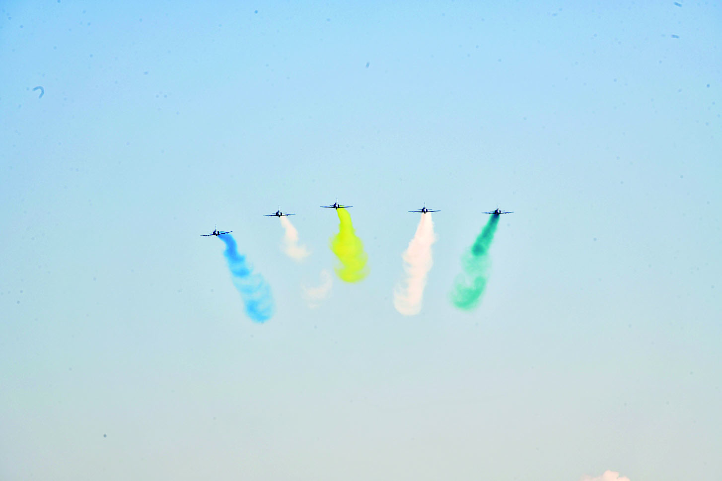 ထိုသို့ စွမ်းရည်ပြသရာတွင် MiG-29 ဘက်စုံသုံးဂျက်တိုက်လေယာဉ်တစ်စီးက ရှုရပ်၏ ရှေ့တည့်တည့်မှ ဝင်ရောက်လာပြီး Victory Roll Maneuver နှင့် Level 8 Maneuver ကိုလည်းကောင်း၊ Combat Turn နှင့် Multiple Roll Maneuver ကိုလည်းကောင်း၊ Slow Flight နှင့် Zoom Climb Maneuver ၊ Vertical Roll Maneuver တို့ကိုလည်းကောင်း စွမ်းရည်ပြပျံသန်းပြီး MiG-29 ဘက်စုံသုံး ဂျက်တိုက်လေယာဉ် ၄ စီးက ရှုရပ်၏ ရှေ့တည့်တည့်မှ Box Formation ပုံစံဖြင့် အုပ်ဖွဲ့ပျံသန်းအလေးပြုကြသည်။