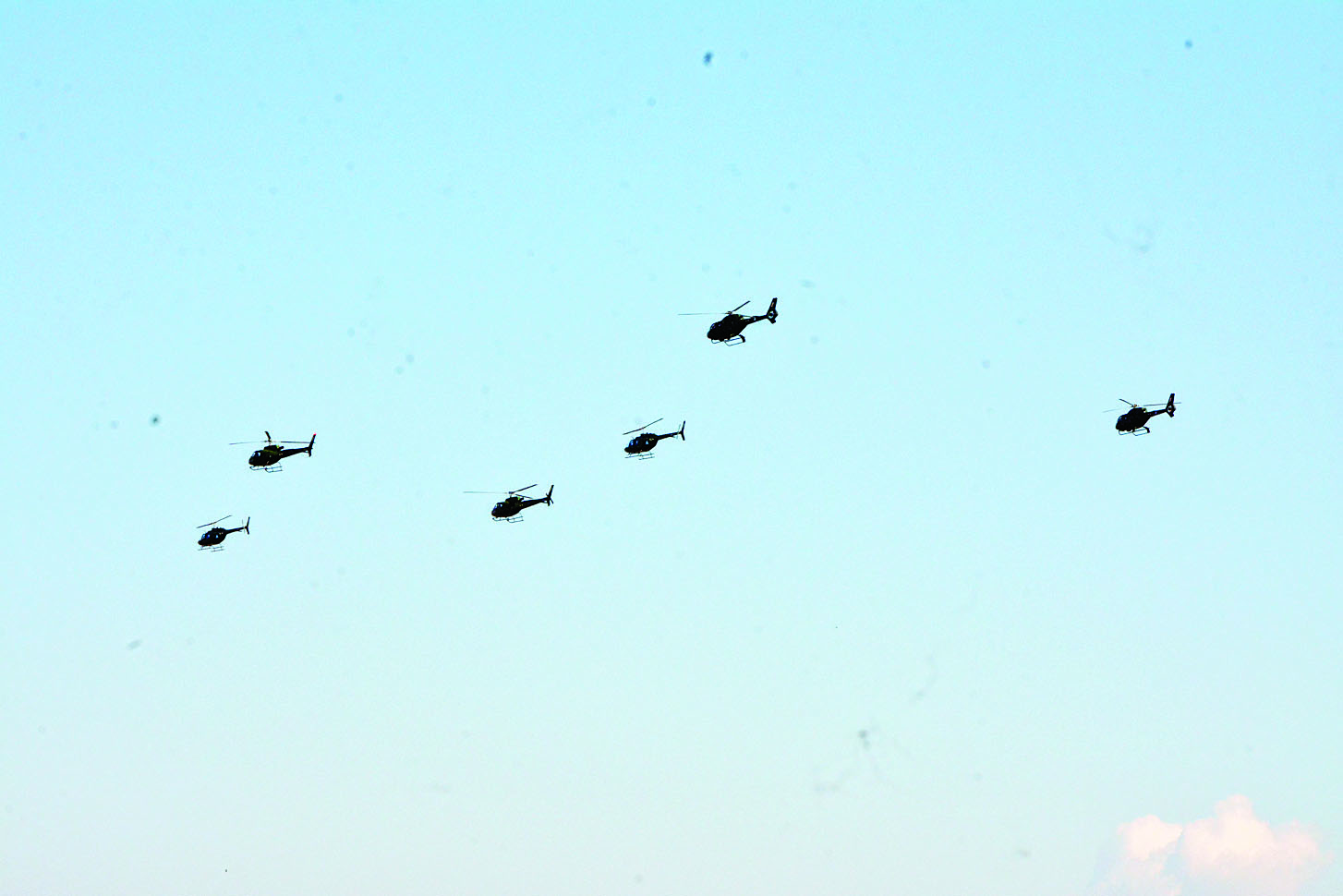 ထို့နောက် လေယာဉ်၊ ရဟတ်ယာဉ်များ သရုပ်ပြအုပ်ဖွဲ့ပျံသန်းအလေးပြုခြင်းနှင့် စွမ်းရည်ပြသခြင်းများကို ဆောင်ရွက်ရာ Mi-17 ရဟတ်ယာဉ် ၄ စီးက Arrow Head Formation ပုံစံဖြင့်လည်းကောင်း၊ Bell 206 ရဟတ် ယာဉ် ၂ စီး၊ H-125 ရဟတ်ယာဉ် ၂ စီး၊ H - 120 ရဟတ်ယာဉ် ၂ စီးတို့က Composite Formation ပုံစံဖြင့်လည်းကောင်း၊ MTX-1B ကင်းထောက်လေယာဉ် ၁ စီးနှင့် Grob-120 TP အမောင်းသင်လေယာဉ် ၃ စီးတို့က Composite Formation ပုံစံဖြင့်လည်းကောင်း၊ K-8 ဂျက်တိုက်လေယာဉ် ၅ စီးတို့က Kite Formation ပုံစံဖြင့်လည်းကောင်း၊ F - 7 တိုက်လေယာဉ် ၄ စီးက Box Formation ပုံစံဖြင့်လည်းကောင်း၊ MiG-29 ဘက်စုံသုံးဂျက်တိုက်လေယာဉ် ၅ စီးက Arrow Head Formation ပုံစံဖြင့်လည်းကောင်း၊ Su-30 SME ဘက်စုံသုံး အကြီးစားဂျက်တိုက်လေယာဉ် ၂ စီး နှင့် FTC 2000G တိုက်လေယာဉ် ၂ စီးတို့က Composite Formation ပုံစံဖြင့်လည်းကောင်း အသီးသီးသရုပ်ပြပျံသန်းကြသည်။ ဆက်လက်ပြီး MiG-29 ဘက်စုံသုံးဂျက်တိုက်လေယာဉ်များနှင့် စတုတ္ထမျိုးဆက်လွန် ဘက်စုံသုံးအကြီးစားတိုက်လေယာဉ်ဖြစ်သည့် Su-30 SME တိုက်လေယာဉ်များက အဆင့်မြင့်လှုပ်ရှားစစ်ကစားမှု (High Performance Maneuver) များအား စွမ်းရည်ပြပျံသန်းခြင်းများကို ဆောင်ရွက်သည်။