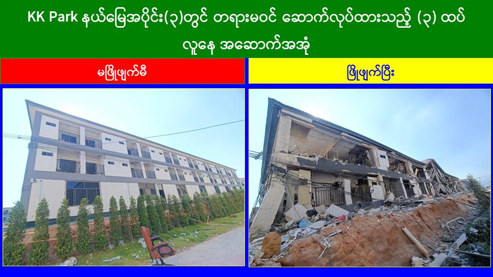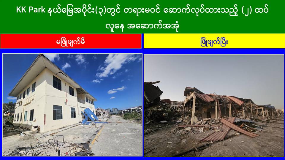 ထိုသို့ အွန်လိုင်းလိမ်လည်လောင်းကစားမှုတိုက်ဖျက်ရေးလုပ်ငန်းများ ဆောင်ရွက်လျက်ရှိရာ ယနေ့တွင် မြဝတီ-မဲထော်သလေး (KK Park) နယ်မြေအတွင်းရှိ အွန်လိုင်းလိမ်လည်လောင်းကစားမှုများကျူးလွန်ရာတွင် အသုံးပြုခဲ့သည့် အပိုင်း(၃)နယ်မြေအတွင်းရှိ တရားမဝင် ၃ ထပ်အဆောက်အအုံ ၅ လုံး၊ ၂ ထပ်အဆောက်အအုံ ၂ လုံးနှင့် ၁ ထပ်အဆောက်အအုံ ၃ လုံး၊ စုစုပေါင်း တရားမဝင်အဆောက်အအုံ ၁၀ လုံးကို ထပ်မံဖြိုချဖျက်ဆီးခဲ့သဖြင့် KK Park နယ်မြေအတွင်းရှိ တရားမဝင်အဆောက်အအုံ စုစုပေါင်း ၆၃၅ လုံး အနက် ၄၆၆ လုံးကို စနစ်တကျဖြိုချဖျက်ဆီးပြီးဖြစ်ကြောင်း သိရှိရသည်။