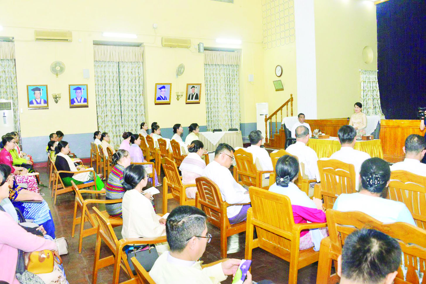 ရန်ကုန်တက္ကသိုလ် သိပ္ပံပွဲခင်း ကျင်းပနိုင်ရေး ရန်ကုန်တက္ကသိုလ် ပါမောက္ခချုပ်၊ ဒုတိယပါမောက္ခချုပ်များ၊ ပါမောက္ခ (ဌာနမှူး) များနှင့်တွေ့ဆုံဆွေးနွေးပွဲကို ယနေ့မွန်းလွဲပိုင်းတွင် ရန်ကုန်တက္ကသိုလ် ဝိဇ္ဇာခန်းမ၌ ကျင်းပရာ ဒုတိယဝန်ကြီး ဦးနေမျိုးလှိုင်၊ ညွှန်ကြားရေးမှူးချုပ်များ၊ ဒုတိယညွှန်ကြားရေးမှူးချုပ်များနှင့် တာဝန်ရှိသူများ တက်ရောက်ကြသည်။