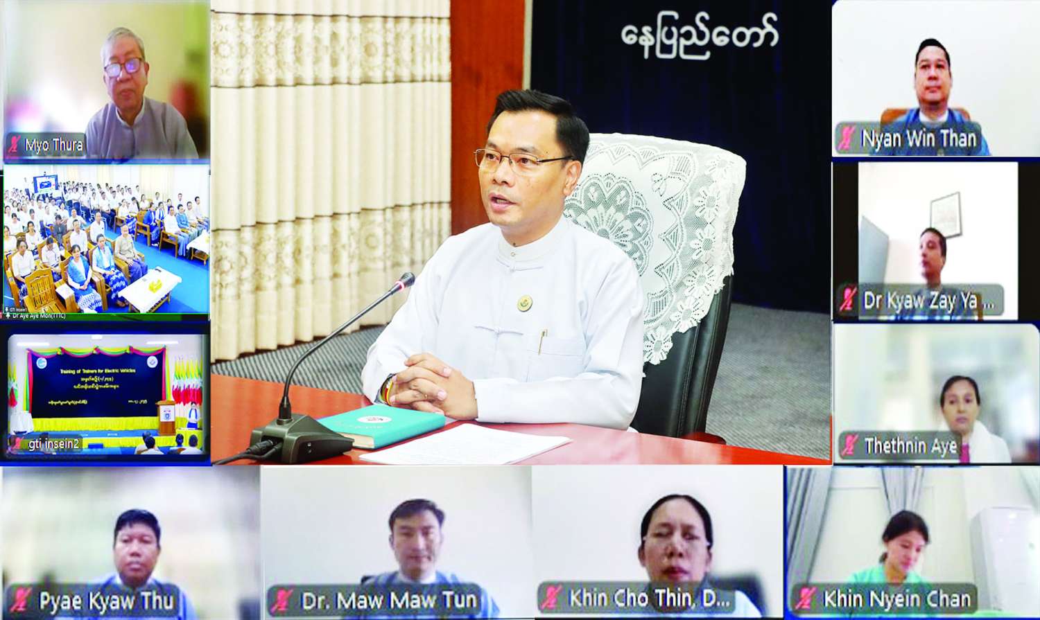 လျှပ်စစ်သုံးယာဉ်နှင့် ဆက်စပ်ပစ္စည်းများ သုတေသနဖွံ့ဖြိုးရေးနှင့် နည်းပညာပြန့်ပွားရေးလုပ်ငန်းကော်မတီဥက္ကဋ္ဌ သိပ္ပံနှင့်နည်းပညာဝန်ကြီးဌာန ဒုတိယဝန်ကြီး ဒေါက်တာ အောင်ဇေယျသည် ဒီဇင်ဘာ ၁၈ ရက်က နည်းပညာ၊ သက်မွေးပညာနှင့် လေ့ကျင့်ရေးဦးစီးဌာန၊ အစိုးရစက်မှုလက်မှုသိပ္ပံ(အင်းစိန်)၌ ကျင်းပသည့် EV Training of Trainers (၁/၂၀၂၅) သင်တန်းဆင်းပွဲကို ဗီဒီယိုကွန်ဖရင့်ဖြင့် တက်ရောက်သည်။