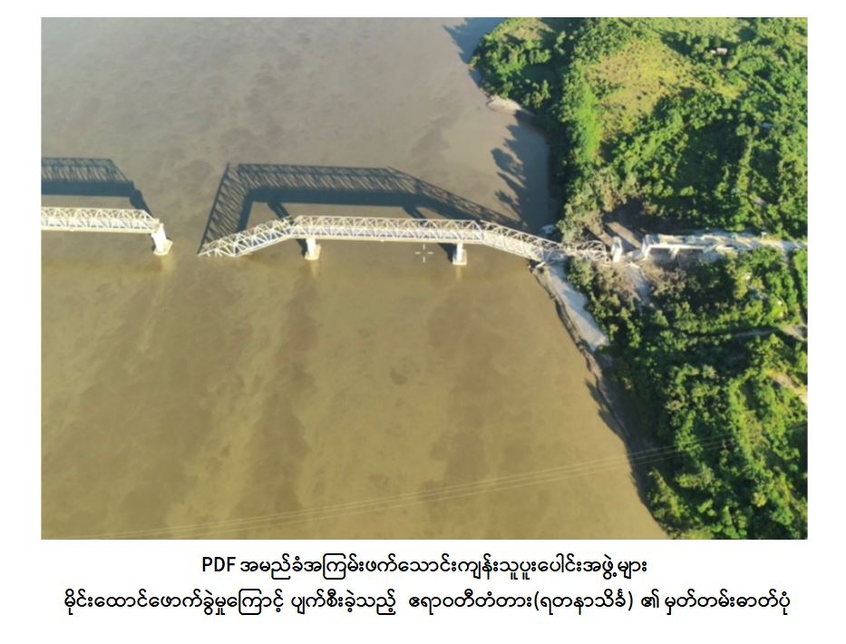 PDF အမည်ခံအကြမ်းဖက်သောင်းကျန်းသူပူးပေါင်းအဖွဲ့များအနေဖြင့် အဆိုပါဒေသအား ယာယီစိုးမိုးထားစဉ် မြို့/ရွာများအတွင်း ဘာသာရေးဆိုင်ရာ အဆောက်အအုံများ၊ စာသင်ကျောင်းများ၊ ဌာနဆိုင်ရာအဆောက်အအုံများ၊ ဆေးရုံများနှင့် လူနေအိမ်များအတွင်း ဝင်ရောက်နေရာယူ၍ ဘန်ကာများပြုလုပ်ခြင်း၊ ပြည်သူများ၏အိုးအိမ်များကို ခံစစ်တံတိုင်းအဖြစ်အကာကွယ်ရယူ၍ ပစ်ခတ်တိုက်ခိုက်ခြင်း၊ ပြည်သူများအဓိကသွားလာအသုံးပြုလျက်ရှိသည့် လမ်း/တံတားများအားမိုင်းထောင်ဖောက်ခွဲခြင်းများ ဆောင်ရွက်လျက်ရှိရာ အောက်တိုဘာ ၂၉ ရက်တွင်လည်း မန္တလေးတိုင်းဒေသကြီး၊ စဉ့်ကူးမြို့နှင့် စစ်ကိုင်းတိုင်းဒေသကြီး၊ ကျောက်မြောင်းမြို့ကို ဆက်သွယ်ထား၍ ပြည်သူလူထု၏ လမ်းပန်းဆက်သွယ်ရေးနှင့် ကုန်စည်စီးဆင်းမှုတို့အတွက်အဓိကအရေးပါသည့် ဧရာဝတီတံတား(ရတနာသိင်္ခ)ကိုလည်း မိုင်းထောင်ဖောက်ခွဲဖျက်ဆီးခဲ့သဖြင့် တံတား၏ရေလယ်တိုင်များဖြစ်သည့် တိုင်အမှတ် RP4 နှင့် RP5 တို့အကြားတွင်လည်းကောင်း၊ RP6-A2 ချဉ်းကပ်လမ်းနေရာတို့တွင်လည်းကောင်း ကျိုးကျပျက်စီးခဲ့သဖြင့် မော်တော်ယာဉ်များနှင့် ခရီးသွားပြည်သူများဖြတ်သန်း သွားလာနိုင်ခြင်းမရှိတော့ဘဲ ကုန်စည်စီးဆင်းမှုများ ရပ်တန့်ခဲ့ရသည်။