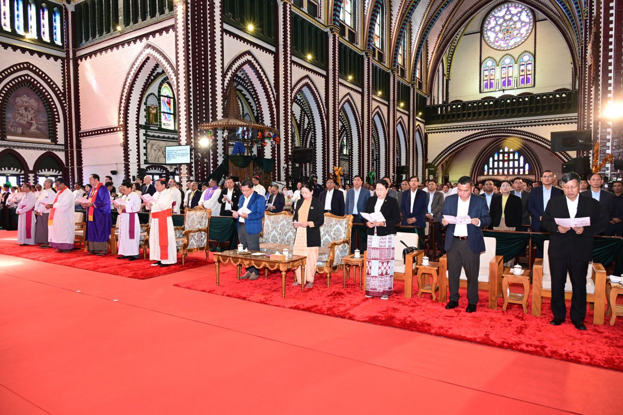 ဦးစွာ နိုင်ငံတော်ယာယီသမ္မတ နိုင်ငံတော်လုံခြုံရေးနှင့်အေးချမ်းသာယာရေးကော်မရှင်ဥက္ကဋ္ဌနှင့်ဇနီး၊ အဖွဲ့ဝင်များသည် စိန့်မေရီကာသီဒြယ်ကက်သလစ်ဘုရား ကျောင်းတော်ကြီးသို့ ရောက်ရှိကြရာ ကက်သလစ်ဂိုဏ်းချုပ်သာသနာ၊ ဂိုဏ်းချုပ်ဆရာတော်ကြီး ကာဒီနယ်ချားလ်စ်ဘိုက ကြိုဆိုနှုတ်ဆက်ပြီး ခရစ်ယာန်လူငယ်လေးများက ခရစ်ယာန်ဓမ္မတေးသီချင်းများဖြင့် သီဆိုတီးမှုတ်ကပြဖျော်ဖြေပြီး ကြိုဆိုနှုတ်ဆက်ကြသည်။