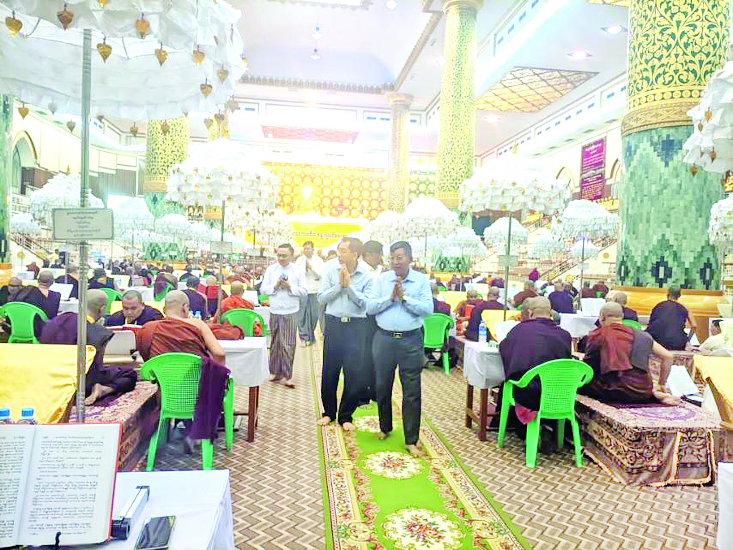 (၇၈)ကြိမ်မြောက် တိပိဋကဓရ တိပိဋကကောဝိဒရွေးချယ်ရေးစာမေးပွဲ၏ ဩဝါဒါစရိယဆရာတော်ကြီးများနှင့် စာပြန်သံဃာတော်များအား ပြည်ထောင်စုဝန်ကြီးများက လာရောက်ဖူးမြော်ကြည်ညို