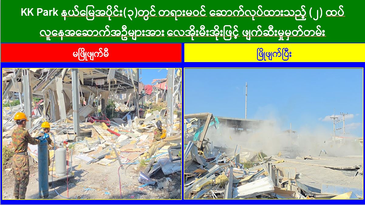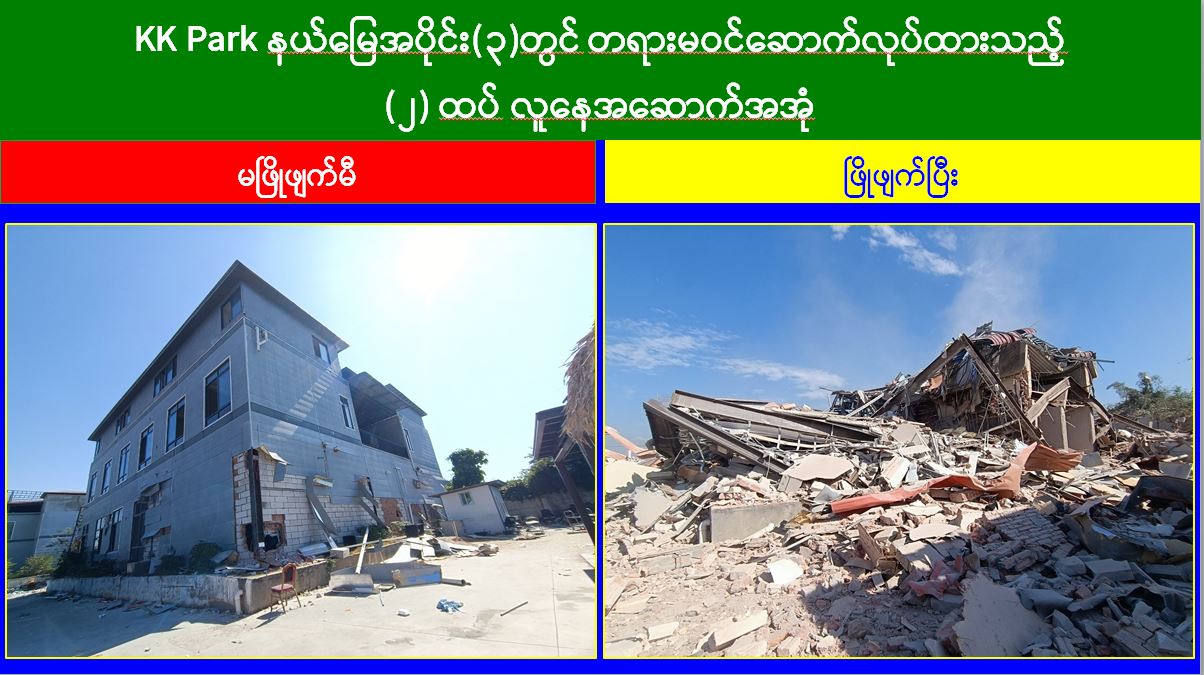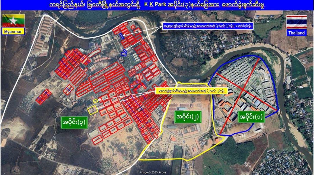 ယနေ့တွင် မြဝတီ-မဲ့ထော်သလေး(KK Park) အပိုင်း(၃)နယ်မြေအတွင်းရှိ အွန်လိုင်းလိမ်လည်လောင်းကစားမှုများကျူးလွန်ရာတွင် အသုံးပြုခဲ့သည့် တရားမဝင် ၄ ထပ် အဆောက်အအုံ ၁ လုံး၊ ၂ ထပ်အဆောက်အအုံ ၂ လုံးနှင့် တစ်ထပ်အဆောက်အအုံ ၃ လုံး စုစုပေါင်း တရားမဝင် အဆောက်အအုံ ၆ လုံးတို့ကို ထပ်မံဖြိုချဖျက်ဆီးခဲ့သဖြင့် KK Park နယ်မြေအတွင်းရှိ တရားမဝင်အဆောက်အအုံ စုစုပေါင်း ၆၃၅ လုံးအနက် ၅၂၅ လုံးကို စနစ်တကျဖြိုချဖျက်ဆီးပြီးဖြစ်ကြောင်း သိရှိရသည်။