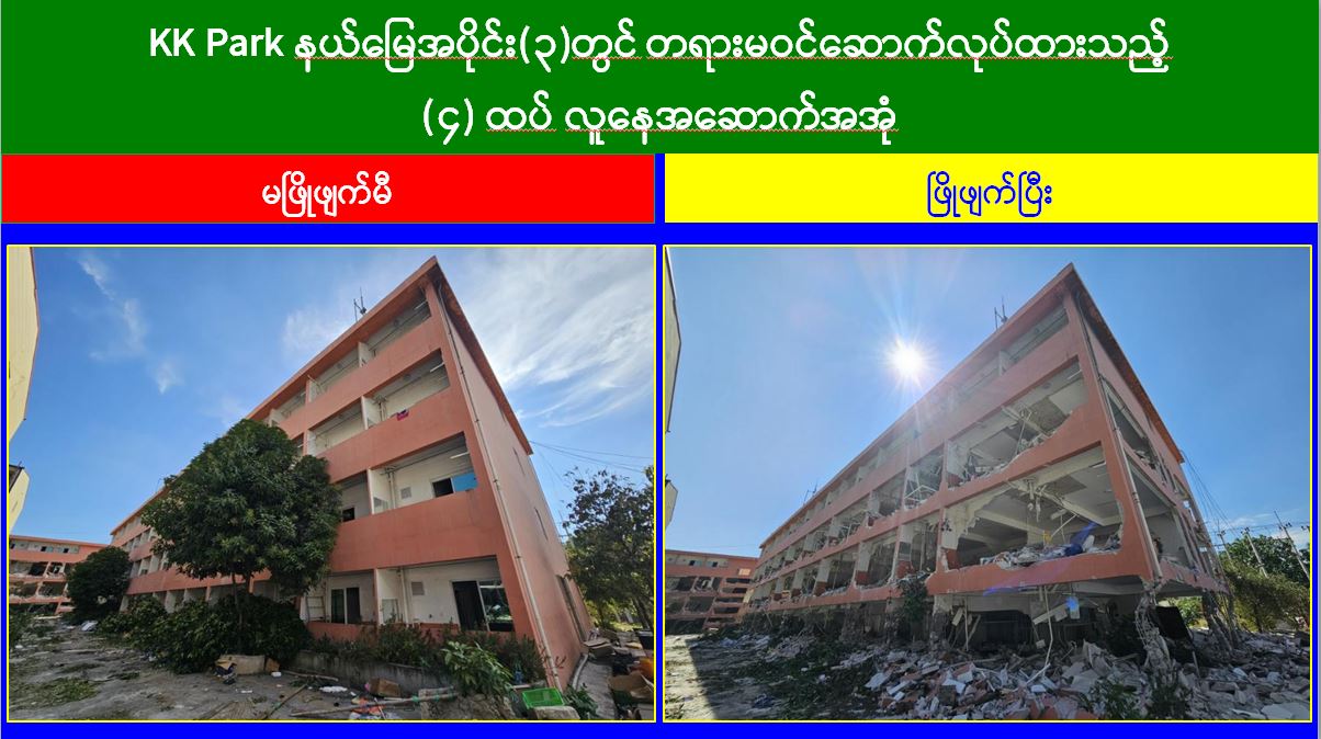 မြန်မာနိုင်ငံအစိုးရအနေဖြင့် အွန်လိုင်းလိမ်လည်လောင်းကစားမှုများ အများဆုံးအခြေချလုပ်ကိုင်လျက်ရှိကြသည့် ရွှေကုက္ကိုလ်နယ်မြေနှင့် KK Park နယ်မြေများရှိ တရားမဝင်အဆောက်အအုံများအတွင်း ဝင်ရောက်ရှင်းလင်းခြင်း၊ အွန်လိုင်းလိမ်လည်လောင်းကစားမှုလုပ်ငန်းစဉ်များတွင် အသုံးပြုခဲ့သည့် သိမ်းဆည်းရမိပစ္စည်းများနှင့် တရားမဝင်အဆောက်အအုံများအား စနစ်တကျဖြိုချဖျက်ဆီးခြင်းများကို လုံခြုံရေးတပ်ဖွဲ့ဝင်များ၊ အုပ်ချုပ်ရေးအဖွဲ့အစည်းများနှင့် ဒေသတွင်းတာဝန်ရှိသူများအပါအဝင် အဖွဲ့စုံပါဝင်သည့် ပူးပေါင်းအဖွဲ့ဖြင့် ဆောင်ရွက်လျက်ရှိရာ ယနေ့တွင် KK Park နယ်မြေအတွင်းရှိ တရားမဝင်အဆောက်အအုံ ၆ လုံးကို ထပ်မံဖြိုချဖျက်ဆီးခဲ့ကြောင်း သိရှိရသည်။