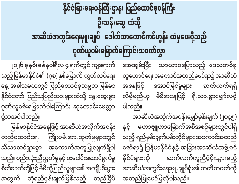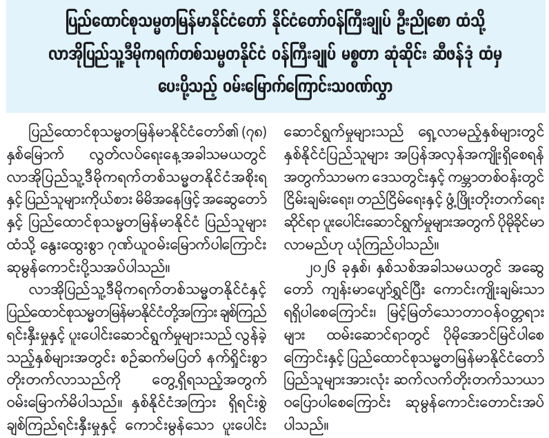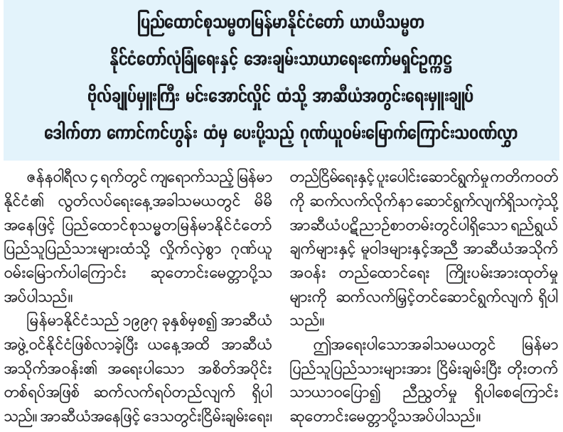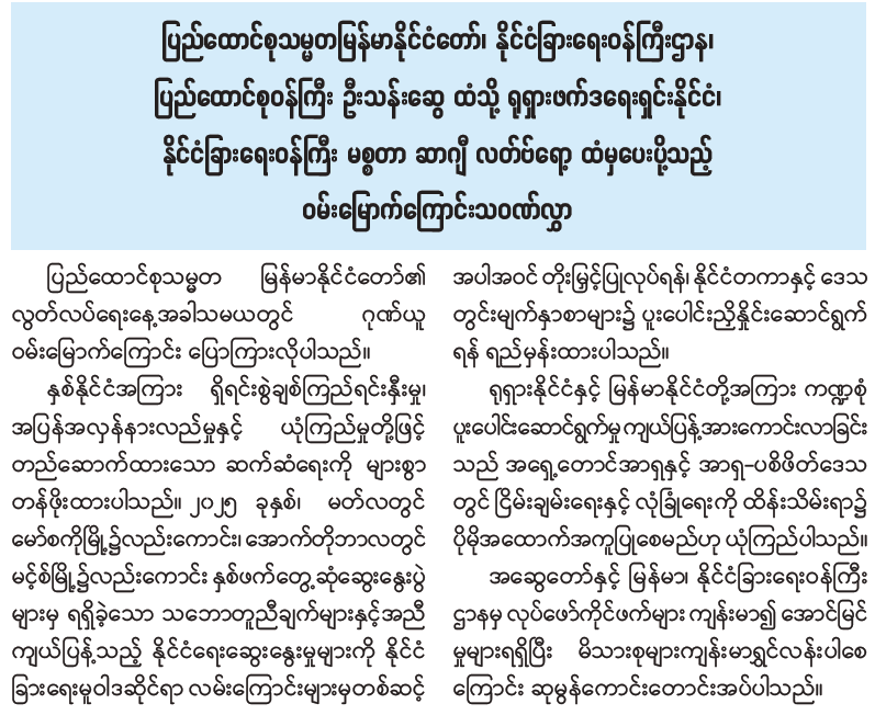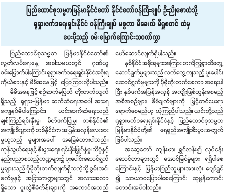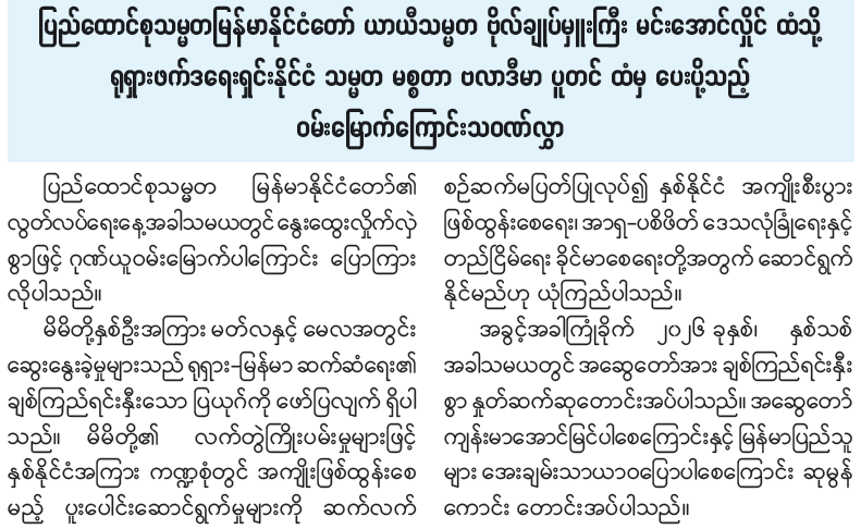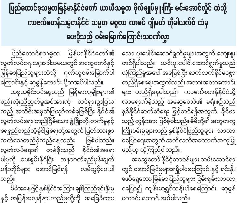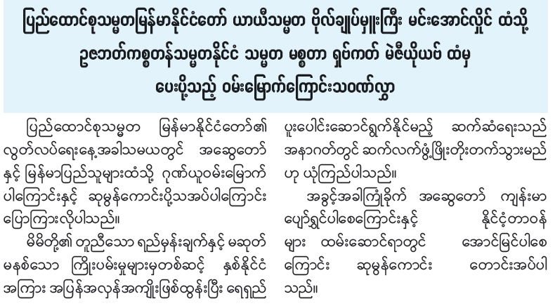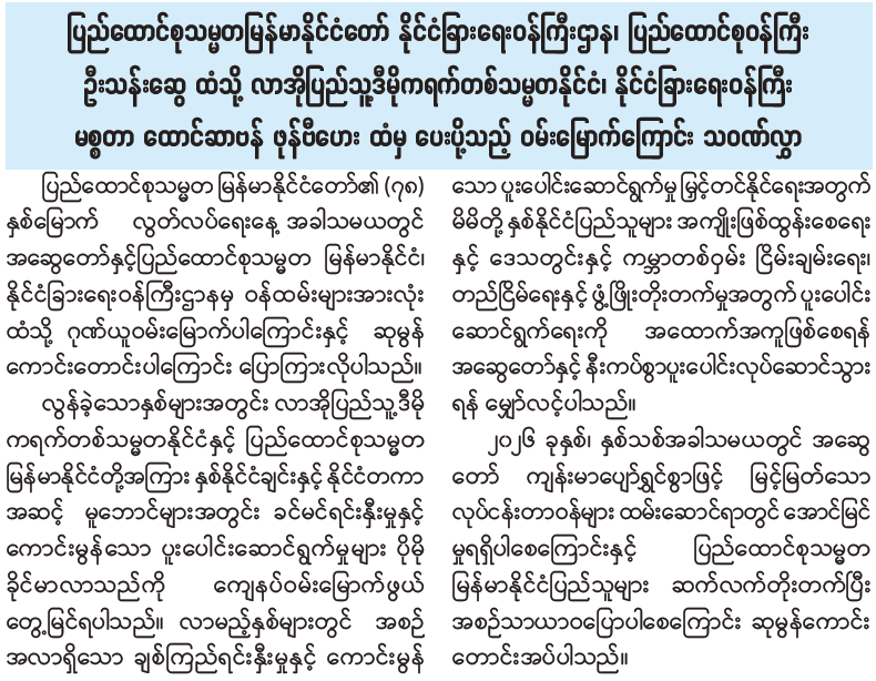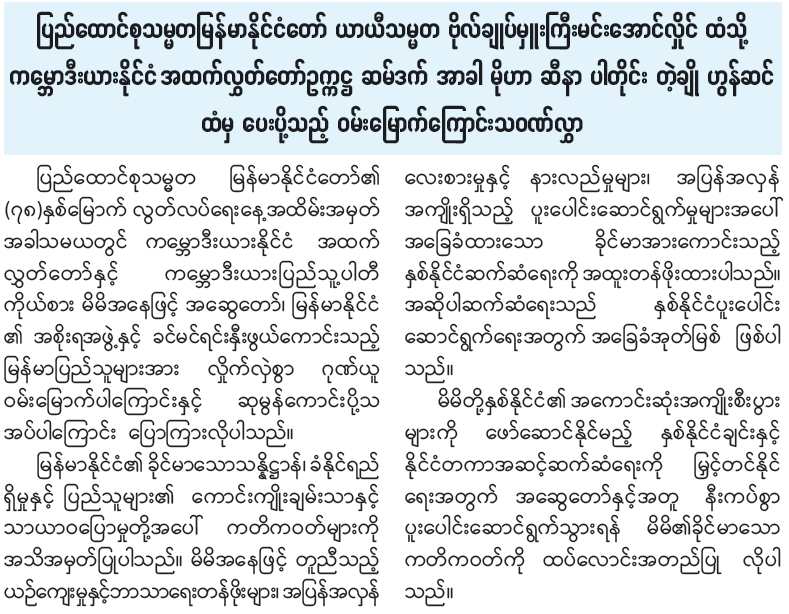 ၂၀၂၆ ခုနှစ် ဇန်နဝါရီလ ၄ ရက်နေ့တွင်ကျရောက်သည့် ပြည်ထောင်စုသမ္မတမြန်မာနိုင်ငံတော်၏ (၇၈)နှစ်မြောက် လွတ်လပ်ရေးနေ့အခါသမယအတွက် ပြည်ပနိုင်ငံအသီးသီးမှ နိုင်ငံအကြီးအကဲများက ပြည်ထောင်စုသမ္မတမြန်မာနိုင်ငံတော် ယာယီသမ္မတ ဗိုလ်ချုပ်မှူးကြီး မင်းအောင်လှိုင်၊ နိုင်ငံတော်ဝန်ကြီးချုပ် ဦးညိုစောနှင့် နိုင်ငံခြားရေးဝန်ကြီးဌာန ပြည်ထောင်စုဝန်ကြီး ဦးသန်းဆွေတို့ထံ ဝမ်းမြောက်ကြောင်း သဝဏ်လွှာများ အသီးသီးပေးပို့ကြပါသည်။