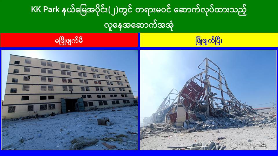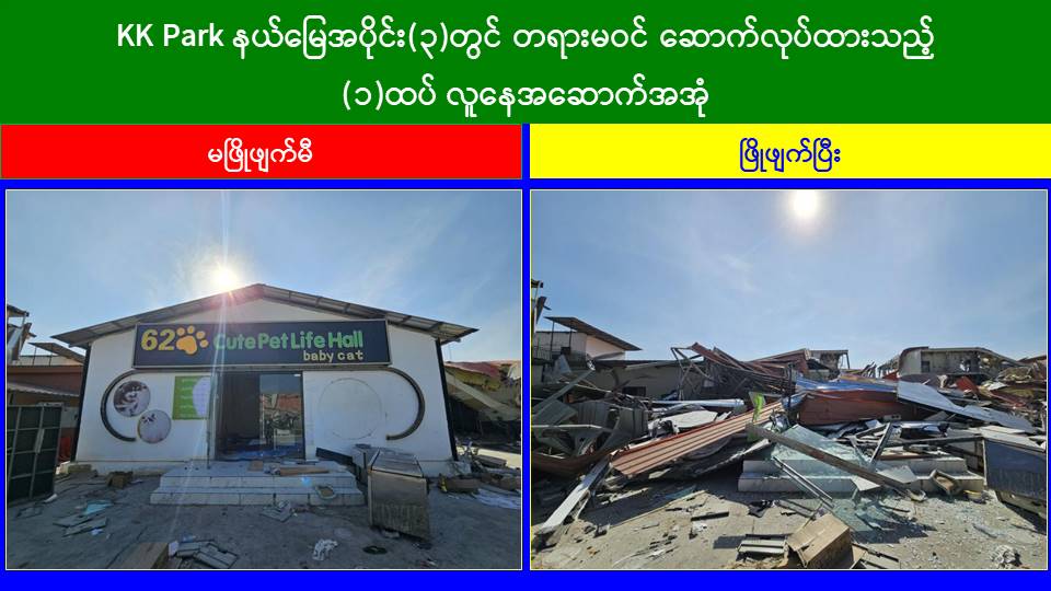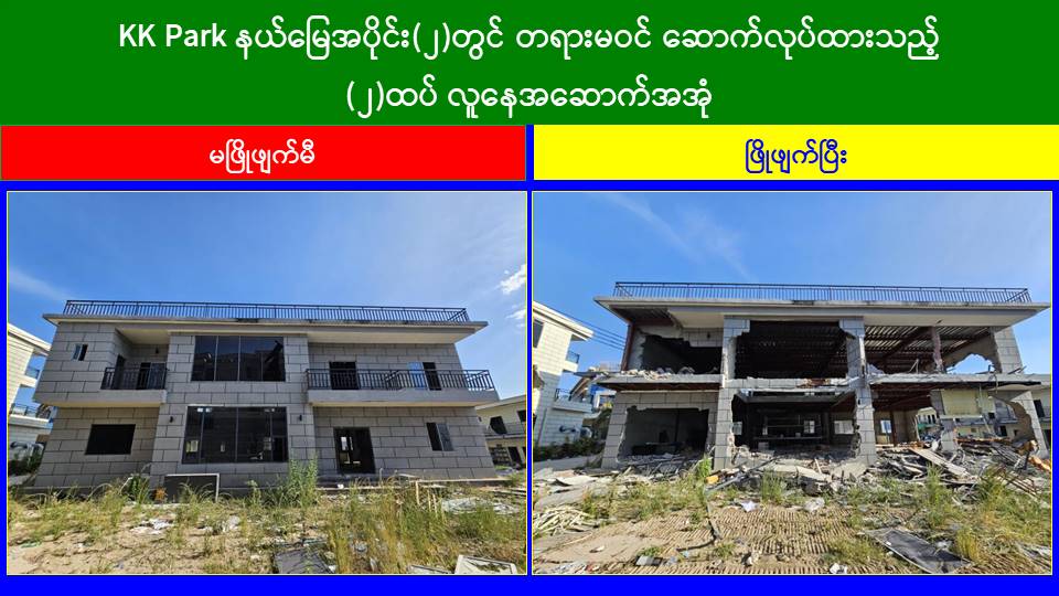ယနေ့တွင် မြဝတီ-မဲထော်သလေး (KK Park) အပိုင်း (၃) နယ်မြေအတွင်းရှိအွန်လိုင်း လိမ်လည်လောင်းကစားမှုများကျူးလွန်ရာတွင် အသုံးပြုခဲ့သည့် တရားမဝင် ၁ ထပ် အဆောက်အအုံ ၅ လုံး၊ ၃ ထပ်အဆောက်အအုံ အပိုင်း (၂) နယ်မြေအတွင်းရှိ အွန်လိုင်းလိမ်လည်လောင်းကစားမှုများ လုံးနှင့် ကျူးလွန်ရာတွင် အသုံးပြုခဲ့သည့် တရားမဝင် ၂ ထပ် အဆောက်အအုံ ၅ လုံး၊ ၃ ထပ်အဆောက်အအုံ ၁ လုံး၊ ၅ ထပ်အဆောက်အအုံ ၂ လုံး၊ စုစုပေါင်း တရားမဝင်အဆောက်အအုံ ၂၁ လုံးတို့ကို ထပ်မံဖြိုချဖျက်ဆီးခဲ့သဖြင့် KK Park နယ်မြေအတွင်းရှိ တရားမဝင်အဆောက်အအုံ စုစုပေါင်း ၆၃၅ လုံးအနက် ၅၈၄ လုံးကို စနစ်တကျ ဖြိုချဖျက်ဆီးပြီးဖြစ်ကြောင်း သိရှိရသည်။