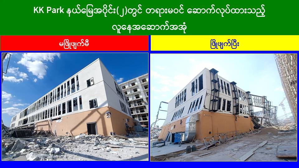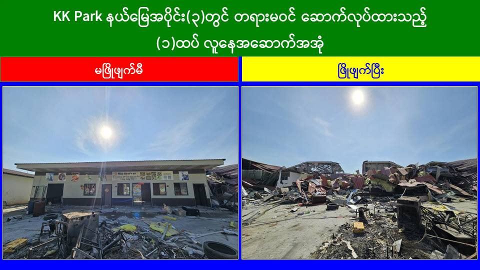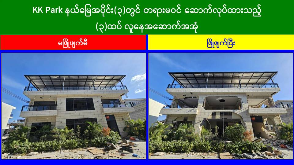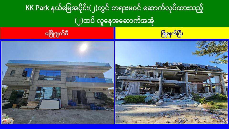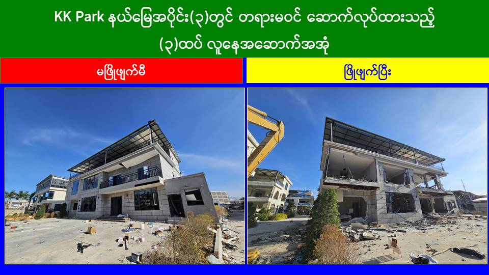 မြန်မာနိုင်ငံအစိုးရအနေဖြင့် အွန်လိုင်းလိမ်လည်လောင်းကစားမှုများ အများဆုံး အခြေချလုပ်ကိုင်လျက်ရှိကြသည့် ရွှေကုက္ကိုလ်နယ်မြေနှင့် KK Park နယ်မြေများရှိတရားမဝင် အဆောက်အအုံများအတွင်း ဝင်ရောက်ရှင်းလင်း၍ အွန်လိုင်းလိမ်လည် လောင်းကစားမှုလုပ်ငန်းစဉ်များတွင် အသုံးပြုခဲ့သည့် သိမ်းဆည်းရမိပစ္စည်းများအား စနစ်တကျဖျက်ဆီးခြင်းနှင့် တရားမဝင်အဆောက်အအုံများအား စနစ်တကျဖြိုချ ဖျက်ဆီးခြင်းများကို အဖွဲ့စုံပါဝင်သည့်ပူးပေါင်းအဖွဲ့ဖြင့် ဆောင်ရွက်လျက်ရှိရာ ယနေ့တွင်လည်း KK Park နယ်မြေအတွင်းရှိ တရားမဝင်အဆောက်အအုံ ၂၁ လုံးကို ထပ်မံဖြိုချဖျက်ဆီးခဲ့ကြောင်း သိရှိရသည်။