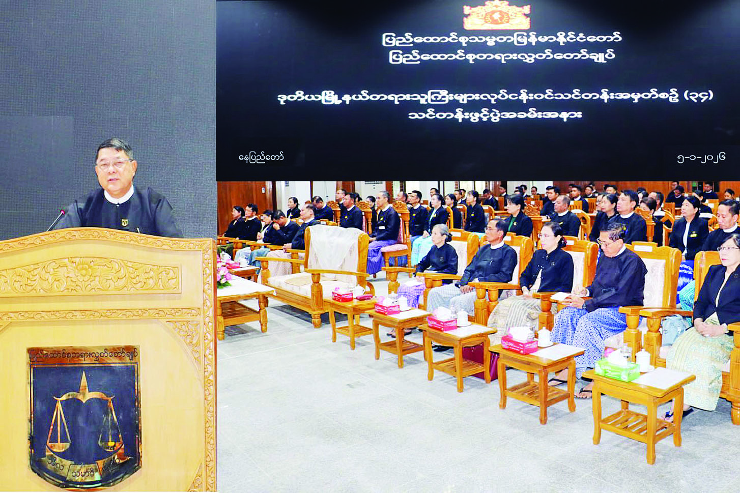 ဒုတိယမြို့နယ်တရားသူကြီးများ လုပ်ငန်းဝင်သင်တန်း အမှတ်စဉ် (၃၄) သင်တန်းဖွင့်ပွဲ အခမ်းအနားကို ယနေ့နံနက် ၈ နာရီတွင် ပြည်ထောင်စုတရားလွှတ်တော်ချုပ် တရားရေးကောလိပ် (Judicial College) ၌ ကျင်းပရာ ပြည်ထောင်စုတရားသူကြီးချုပ် ဦးသာဌေး တက်ရောက်၍ သင်တန်းဖွင့်အမှာစကားပြောကြားသည်။