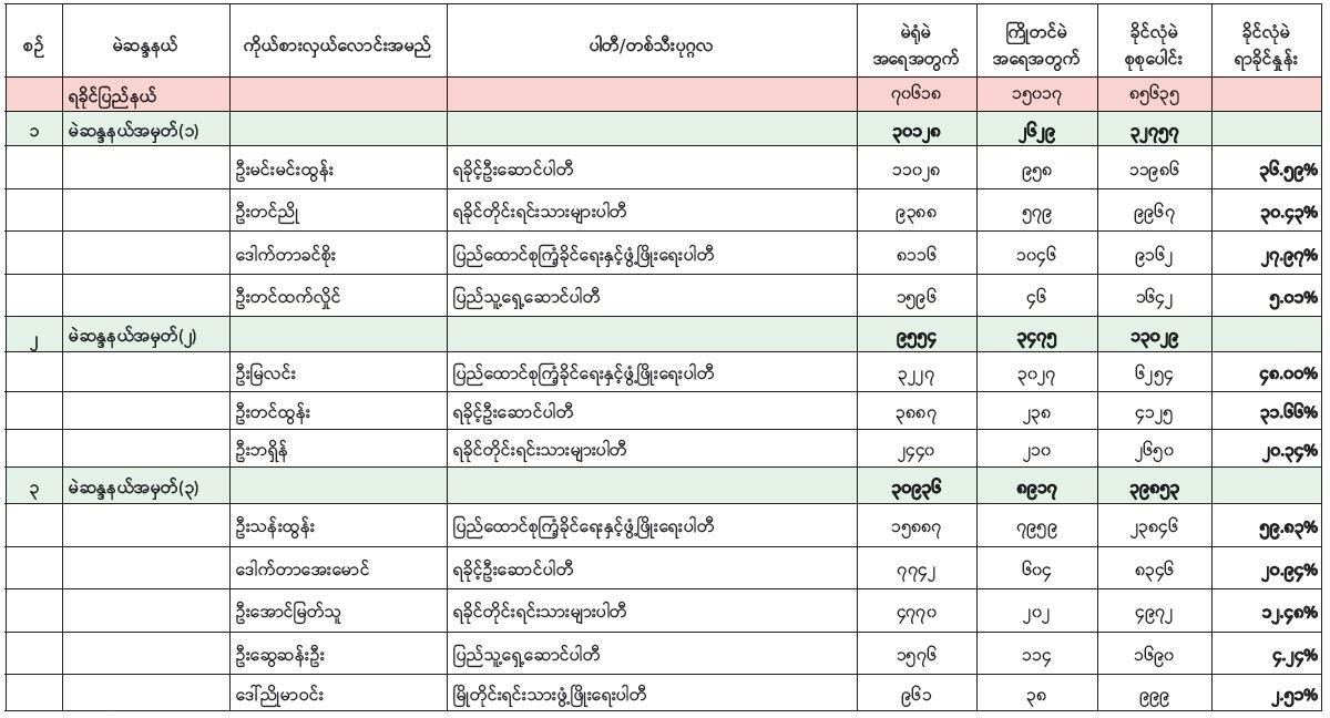 ၂၀၂၅ ခုနှစ် ပါတီစုံဒီမိုကရေစီအထွေထွေရွေးကောက်ပွဲအပိုင်း (၁) အမျိုးသားလွှတ်တော် (မဲအများဆုံးရသူအနိုင်ယူစနစ်) ကိုယ်စားလှယ်လောင်းတစ်ဦးချင်း၏ ဆန္ဒမဲရရှိမှုအခြေအနေ