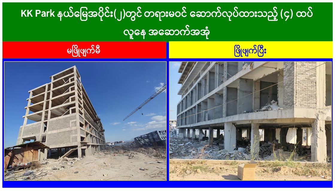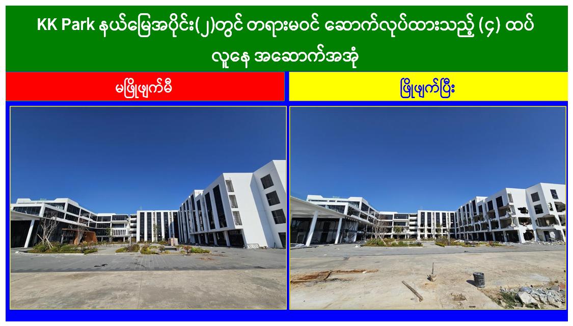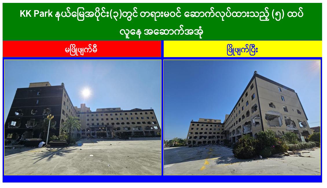 မြန်မာနိုင်ငံအစိုးရအနေဖြင့် အွန်လိုင်းလိမ်လည်လောင်းကစားမှုများ အများဆုံးအခြေချလုပ်ကိုင်လျက်ရှိကြသည့် ရွှေကုက္ကိုလ်နယ်မြေနှင့် KK Park နယ်မြေများရှိတရားမဝင် အဆောက်အအုံများအတွင်း ဝင်ရောက်ရှင်းလင်း၍ အွန်လိုင်းလိမ်လည် လောင်းကစားမှုလုပ်ငန်းစဉ်များတွင် အသုံးပြုခဲ့သည့် သိမ်းဆည်းရမိပစ္စည်းများအား စနစ်တကျဖျက်ဆီးခြင်းနှင့် တရားမဝင်အဆောက်အအုံများအား စနစ်တကျဖြိုချဖျက်ဆီးခြင်းများကို အဖွဲ့စုံပါဝင်သည့် ပူးပေါင်းအဖွဲ့ဖြင့် ဆောင်ရွက်လျက်ရှိရာ ယနေ့တွင်လည်း KK Park နယ်မြေအတွင်းရှိ တရားမဝင်အဆောက်အအုံ ၂၁ လုံးကို ထပ်မံဖြိုချဖျက်ဆီးခဲ့ကြောင်း သိရှိရသည်။