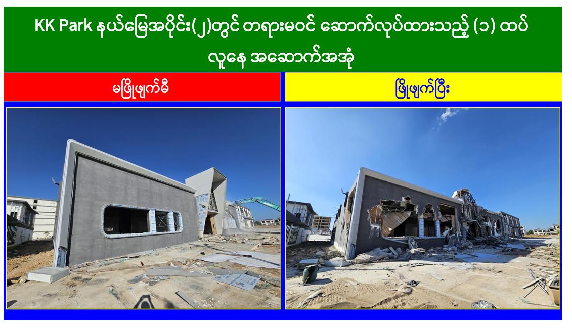ယနေ့တွင် မြဝတီ-မဲထော်သလေး(KK Park) အပိုင်း(၃)နယ်မြေအတွင်းရှိ အွန်လိုင်းလိမ်လည်လောင်းကစားမှုများ ကျူးလွန်ရာတွင် အသုံးပြုခဲ့သည့် တရားမဝင် ၄ ထပ်အဆောက်အအုံ ၁ လုံး၊ ၅ ထပ်အဆောက်အအုံ ၁ လုံးနှင့် အပိုင်း(၂)နယ်မြေအတွင်းရှိ အွန်လိုင်းလိမ်လည်လောင်းကစားမှုများ ကျူးလွန်ရာတွင် အသုံးပြုခဲ့သည့် တရားမဝင် ၁ ထပ် အဆောက်အအုံ ၇ လုံး၊ ၂ ထပ်အဆောက်အအုံ ၁၀ လုံး၊ ၄ ထပ်အဆောက်အအုံ ၂ လုံး၊ စုစုပေါင်း တရားမဝင်အဆောက်အအုံ ၂၁ လုံးတို့ကို ထပ်မံဖြိုချဖျက်ဆီးခဲ့သဖြင့် KK Park နယ်မြေအတွင်းရှိ တရားမဝင်အဆောက်အအုံ စုစုပေါင်း ၆၃၅ လုံး အနက် ၆၃၁ လုံးကို စနစ်တကျ ဖြိုချဖျက်ဆီးပြီးဖြစ်ကြောင်း သိရှိရသည်။